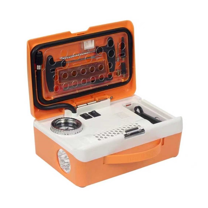 Φτιάξτε το λάστιχο του αυτοκινήτου σας ή της μηχανής σας επιτόπου, γρήγορα και αποτελεσματικά με αυτό το πλήρες σετ επιδιόρθωσης ελαστικών με ενσωματωμένο compressor ισχυρής παροχής 25Lt/m.