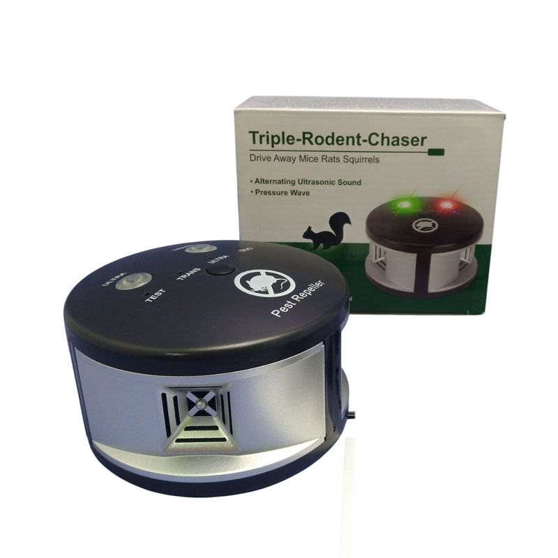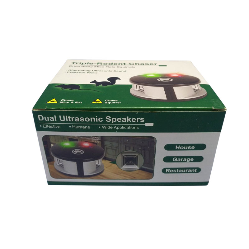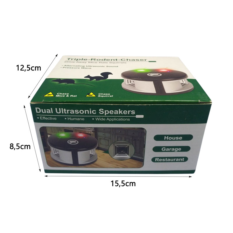 Αποτελεσματικό απωθητικό τρωκτικών με υπερήχους και πίεση αέρα, ιδανικό για χρήση σε εσωτερικούς χώρους όπως το σπίτι, το γκαράζ ή ακόμη και επαγγελματικούς χώρους όπως εστιατόρια. Χρησιμοποιεί εναλλασσόμενο υπερηχητικό ήχο και κύματα πίεσης για να απομακρύνει ποντίκια, αρουραίους και σκίουρους χωρίς τη χρήση χημικών ουσιών ή παγίδων.