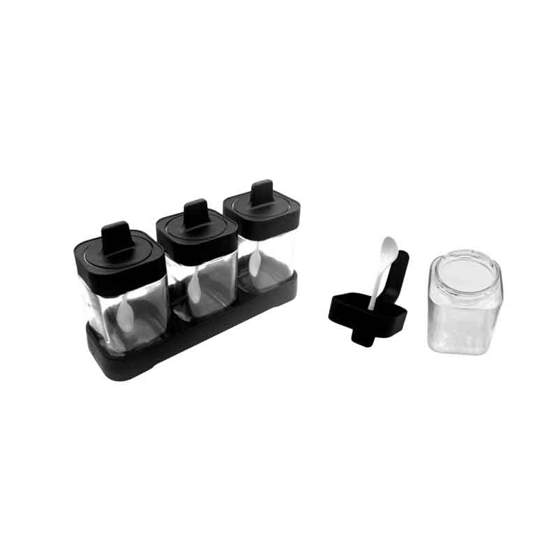 Πρακτικό σετ αποθήκευσης μπαχαρικών με 3 διάφανα δοχεία, καπάκια με λαβή, κουταλάκια και σταθερή βάση. Ιδανικό για καθημερινή χρήση στην κουζίνα για αποθήκευση αλατιού, ζάχαρης, μπαχαρικών ή βοτάνων. Καταλαμβάνει ελάχιστο χώρο και προσφέρει εύκολη πρόσβαση στο περιεχόμενο.