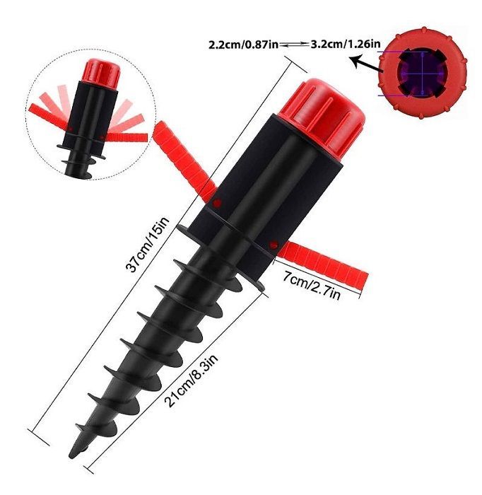 Βάση ομπρέλας θαλάσσης, αιχμηρή με σπιράλ και πτυσσόμενες λαβές για εύκολο βίδωμα και αφαίρεση. Διαθέτει ρυθμιζόμενη διάμετρο με σταθεροποιητή. Κατασκευασμένη από ανθεκτικό πολυπροπυλένιο, χαμηλού βάρους. Μήκος: 37cm.