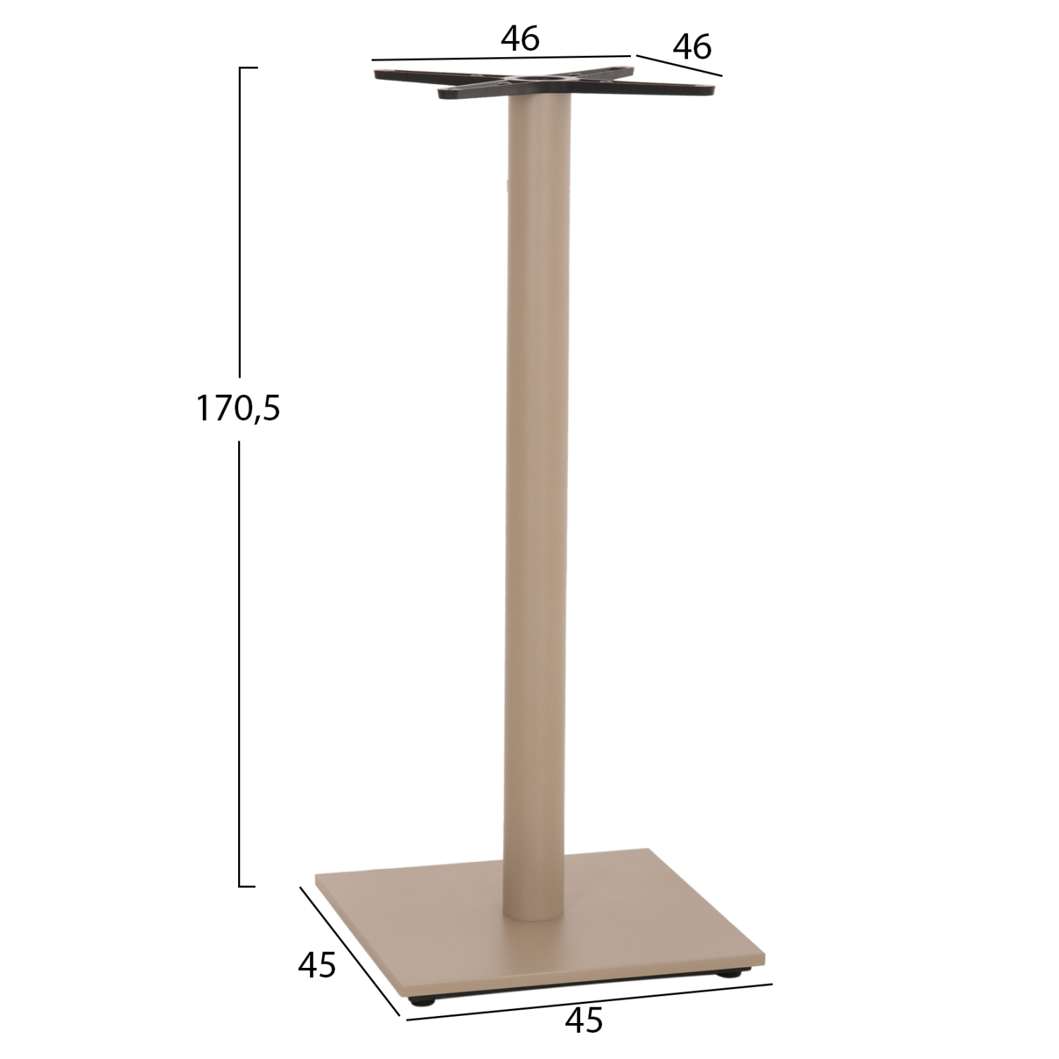 Η FB9439.25 είναι βάση για τραπέζι bar σε ΚΑΠΟΥΤΥΣΙΝΟ ΜΑΤ χρώμα. Αυτή η βάση είναι μεταλλική με μία κολώνα η οποία στηρίζεται σε μια βαριά επίπεδη μεταλλική επιφάνεια. Το χαρακτηριστικό που κάνει αυτή την βάση ιδιαίτερα πρακτική είναι ότι το καπάκι που θα διαλέξετε στηρίζεται σε μια χιαστί μεταλλική διάταξη (σταυρός), με αποτέλεσμα να μπορεί να δεχθεί τόσο στρογγυλά καπάκια, όσο και τετράγωνα. Επίσης, στο κάτω μέρος της διαθέτει ρυθμιστές ύψους (ρεγουλατόρους). Ιδανική πρόταση για συνδυασμό με επιφάνειες σχεδόν κάθε είδους, όπως βερσαλίτες, HPL, MDF, κτλ.