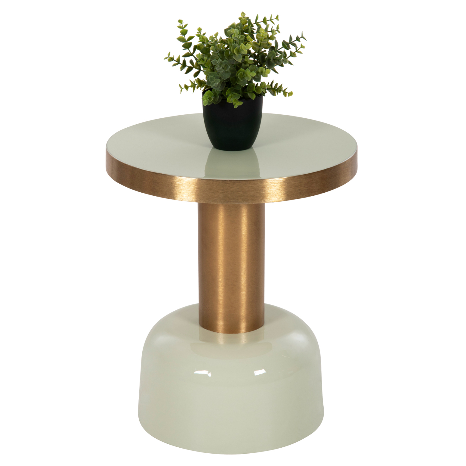 Το βοηθητικό τραπεζάκι FB94243.07 για το σαλόνι είναι μια από τις νέες προσθήκες στην γκάμα μας. Πρόκειται για ένα μεταλλικό τραπεζάκι στρογγυλό με χαμηλή κυλινδρική βάση και ψηλό λαιμό που την συνδέει με την στρογγυλή επιφάνεια. Ο λαιμός και η περίμετρος της επιφάνειας είναι σε ΧΡΥΣΟ χρώμα ενώ η βάση και η επιφάνεια είναι σε χρώμα ΑΝΟΙΧΤΟ ΠΡΑΣΙΝΟ, που δίνουν ένα πολύ ιδιαίτερο αισθητικό αποτέλεσμα. Ιδανικό τόσο για το σπίτι, όσο και για επαγγελματικούς χώρους.