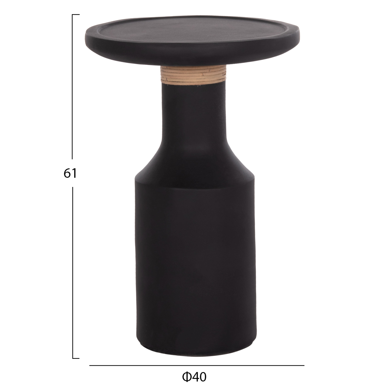 Το βοηθητικό τραπέζι σαλονιού FB918169.01 είναι ψηλό και στρογγυλό με minimal διακόσμηση/επένδυση στον μακρύ «λαιμό» από φυσικό Rattan. Είναι κατασκευασμένο εξολοκλήρου από Fiber Cement σε ΜΑΥΡΟ χρώμα και αποτελεί ιδανικό συμπλήρωμα τόσο για το σπίτι, όσο και για επαγγελματικούς χώρους, όπως ξενοδοχεία, AirBnB, κτλ.