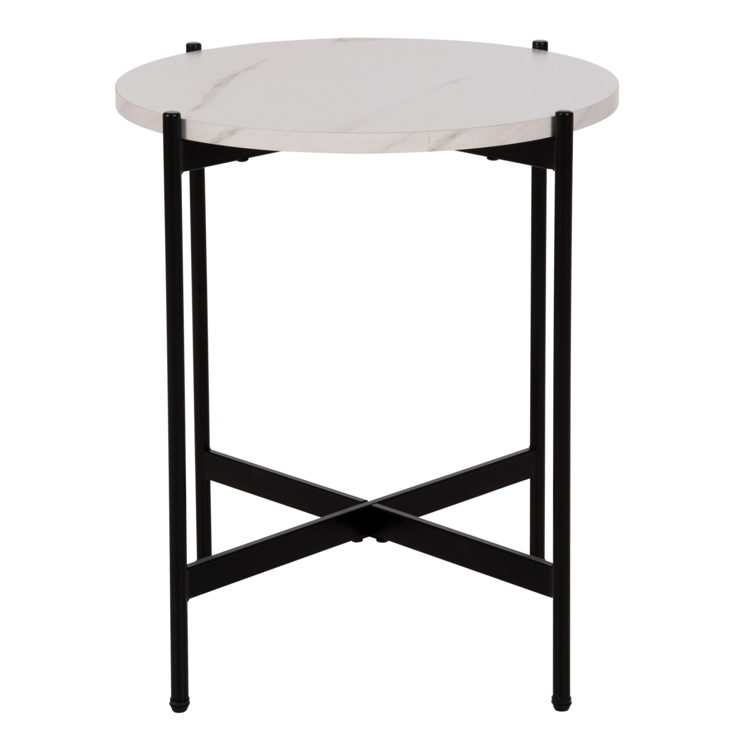 Το βοηθητικό τραπεζάκι FB99589.05 θα σας ενθουσιάσει με το στυλ και την πρακτικότητά του. Πρόκειται για ένα στρογγυλό ψηλό σχετικά τραπεζάκι με ιδιαίτερο χαρακτηριστικό ότι η επιφάνεια στηρίζεται σε μια βάση με χιαστί διάταξη. Η βάση είναι μεταλλική σε ΜΑΥΡΟ χρώμα, ενώ η επιφάνεια είναι κατασκευασμένη από MDF σε χρώμα ΛΕΥΚΟ ΜΑΡΜΑΡΟ.