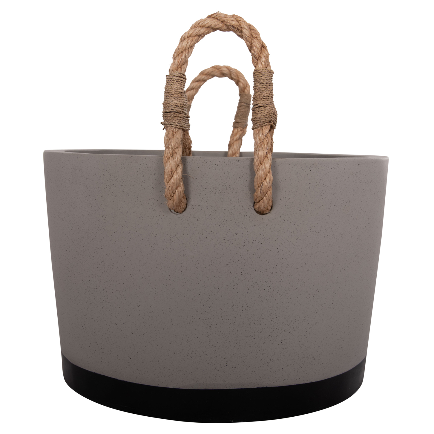 Η γλάστρα FB94690L είναι κατασκευασμένη από Fiber Cement σε ΓΚΡΙ χρώμα με ΜΑΥΡΟ περίγραμμα βάσης. Το ιδιαίτερο χαρακτηριστικό της είναι ότι διαθέτουν χερούλια από ανθεκτικό σχοινί για εύκολη μεταφορά.