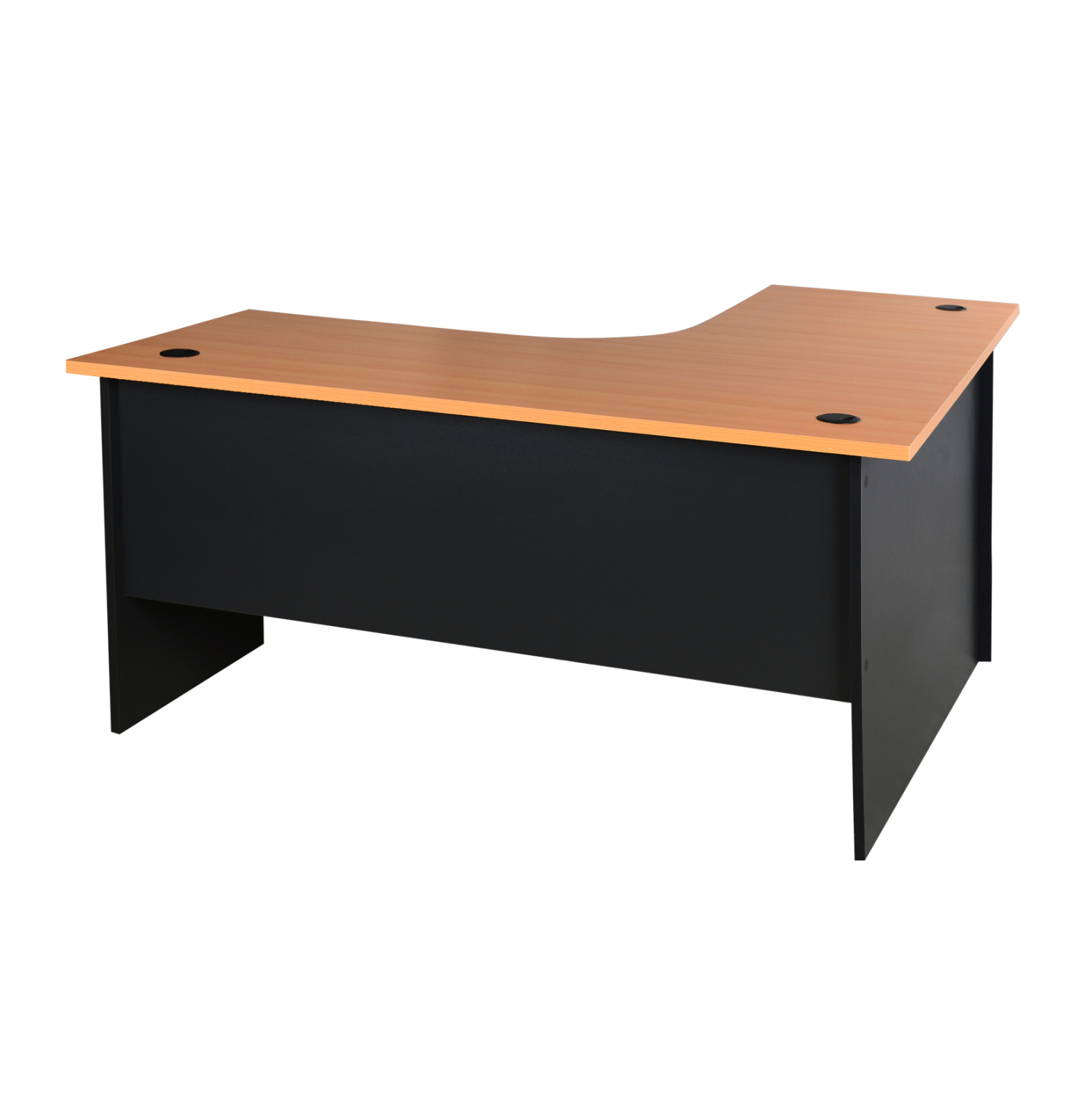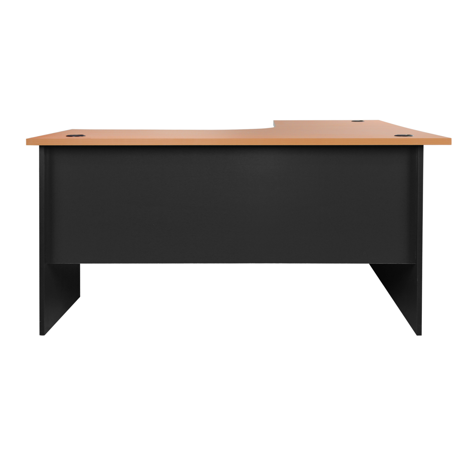 Επιφάνεια εργασίας από μελαμίνη πάχους 25mm στο χρώμα οξιά, με 3 εισόδους καλωδίων πάνω από τα πόδια.Πόδια μελαμίνης πάχους 18mm σε χρώμα γκρί.