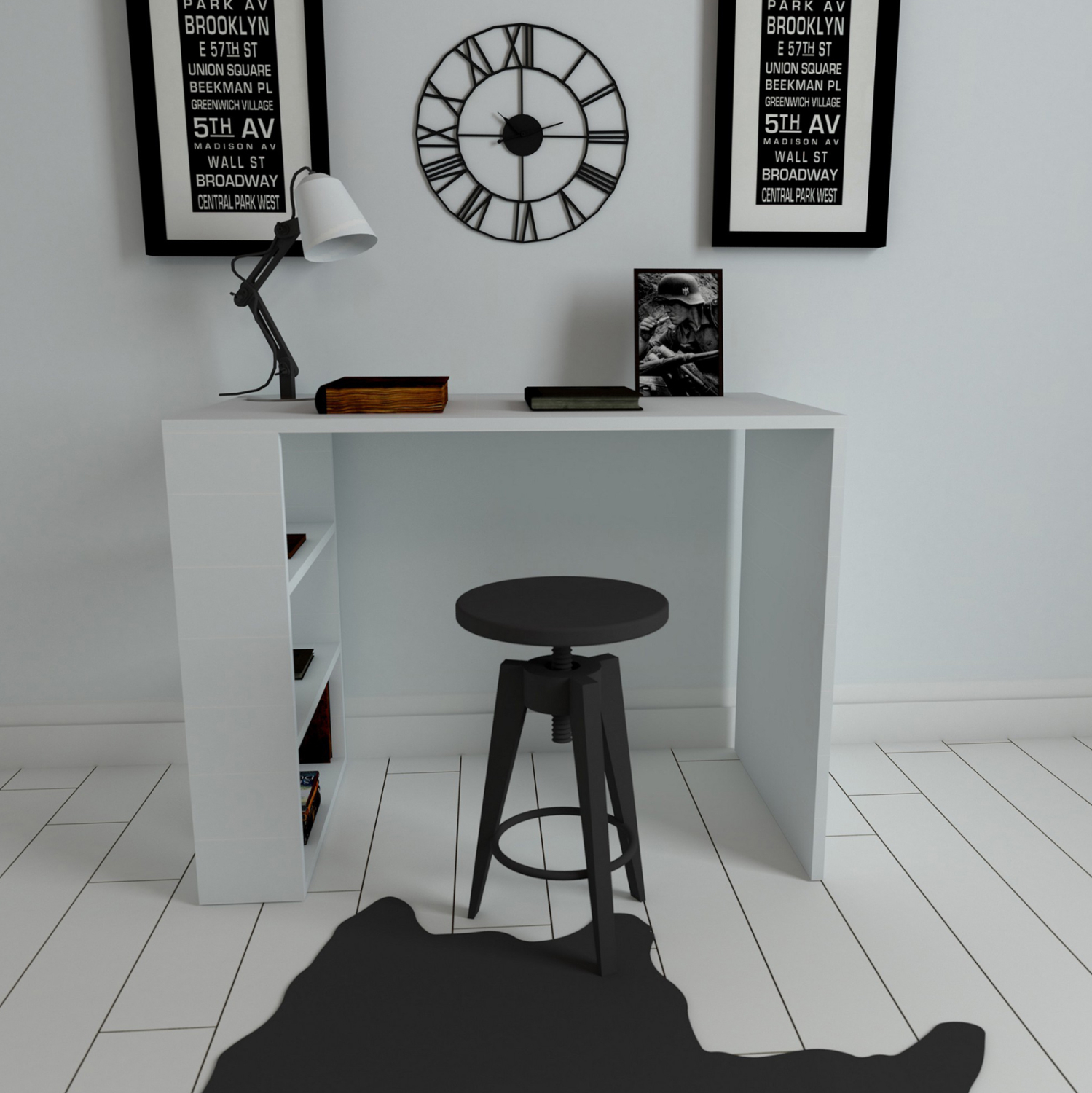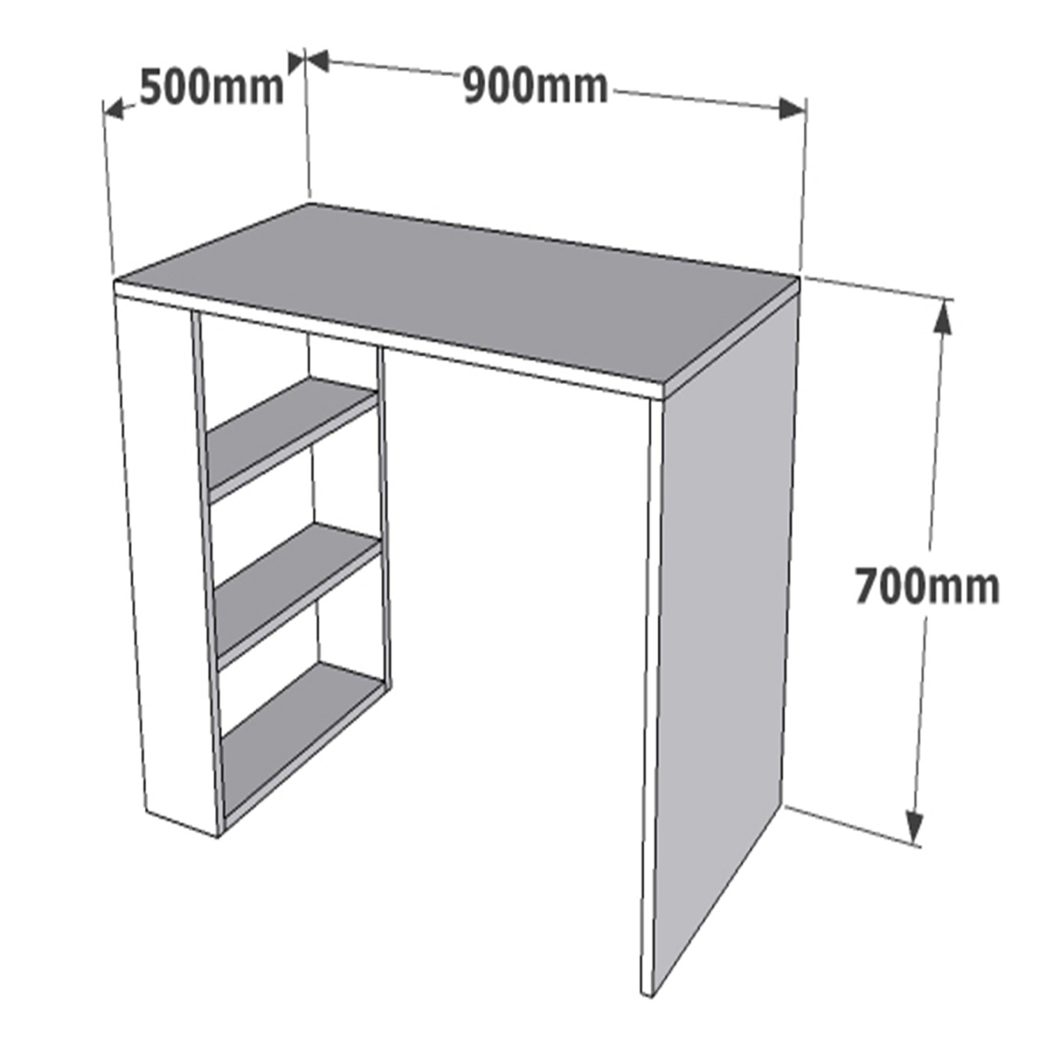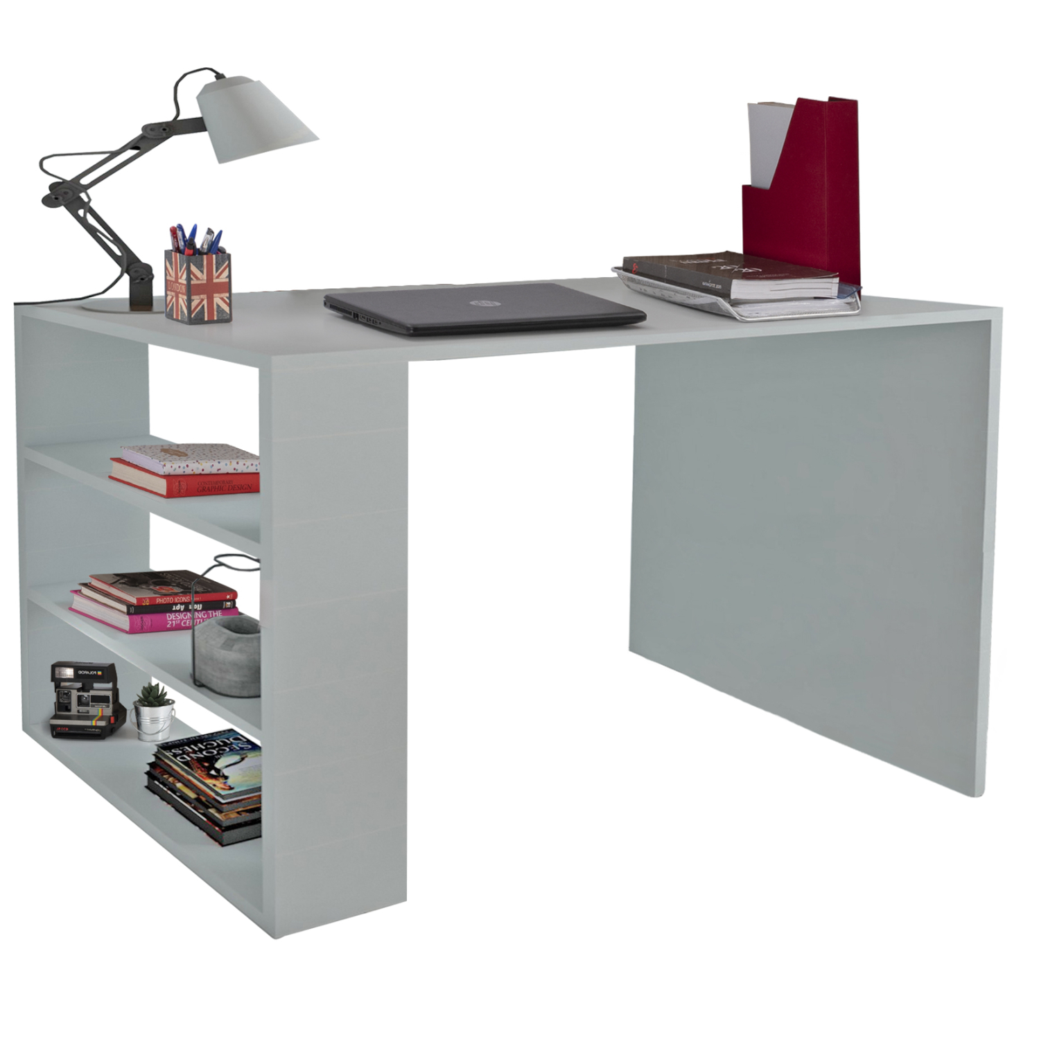 Επιφάνεια εργασίας από μελαμίνη σε λευκό χρώμα και 3 ράφια στο αριστερό μέρος του γραφείου σε λευκή απόχρωση.