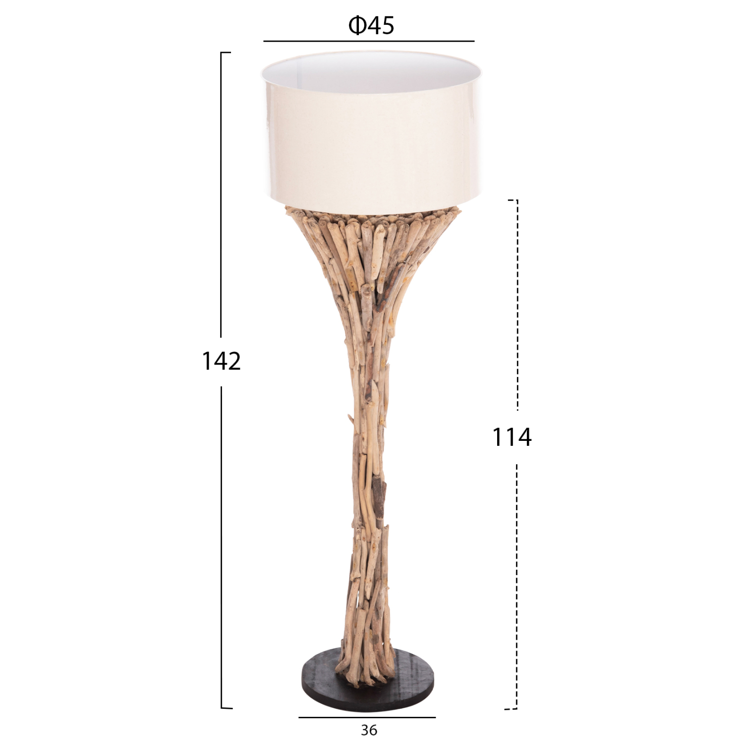 Φωτίστε και ταυτόχρονα διακοσμήστε τον χώρο που επιθυμείτε με το ιδιαίτερο φωτιστικό δαπέδου FB94433. Η κολώνα αποτελείται από κομμάτια driftwood σε ΦΥΣΙΚΟ χρώμα που καλύπτουν την μεταλλική μπάρα η οποία υποστηρίζει το ΛΕΥΚΟ καπέλο που είναι κατασκευασμένο από βαμβακερό ύφασμα με επικάλυψη PVC. To φωτιστικό μπορεί να χρησιμοποιηθεί σε καφέ, εστιατόρια, ξενοδοχεία, ακόμα και στο σπίτι, δίνοντας μια αίσθηση πολυτέλειας και ρουστίκ οικειότητας.