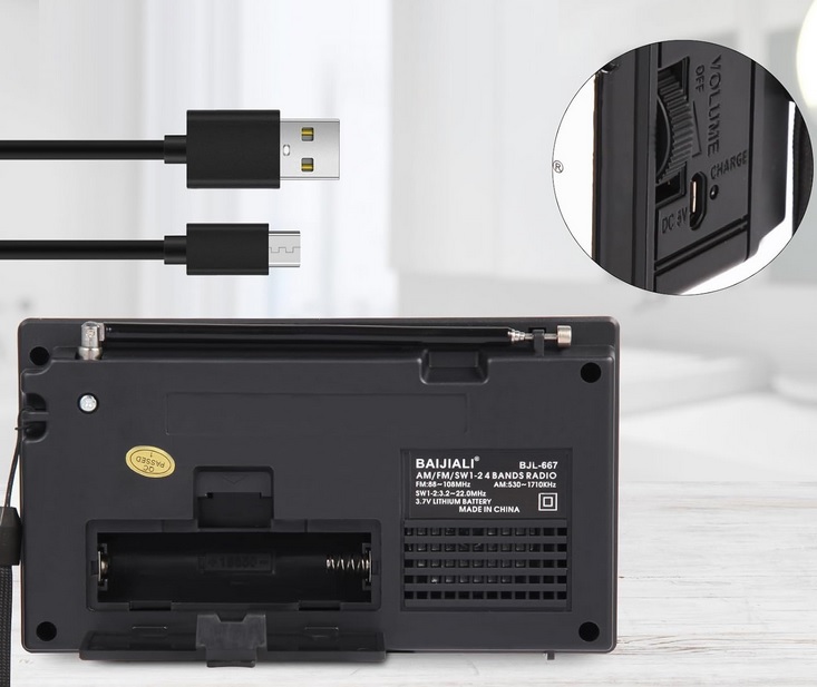 Πτυσσόμενη κεραία για σταθερό σήμα Υποστηριζόμενες Συχνότητες: FM (87-108 MHz) AM (522-1700 kHz) SW (5.6-22 MHz) Υποδοχή για ακουστικά Jack 3.5mm Επαναφορτιζόμενη μπαταρία λιθίου Αυτονομία έως 3 ώρες χρήσης Ηχείο: Φ57mm/4Ω Power: DC 5V Λουράκι μεταφοράς.