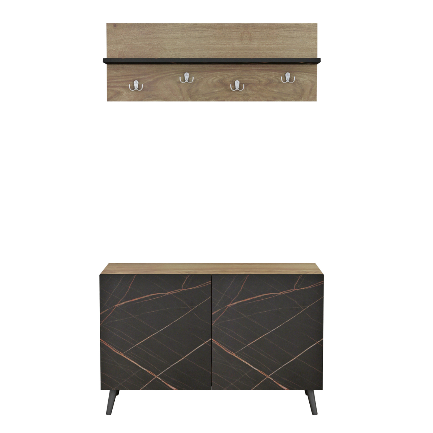 Το σετ εισόδου FB98876.12 αποτελείται από μια παπουτσοθήκη-ντουλάπι με ψηλά πόδια με δύο πόρτες και ενιαίο χώρο αποθήκευσης και μια κρεμάστρα τοίχου με ράφι. Η κρεμάστρα διαθέτει 4 διπλά σημεία κρέμασης ενώ το ράφι προσδίδει επιπλέον πρακτικότητα στο σετ. Ένα σετ μελαμίνης με βολικές διαστάσεις σε χρώμα ΦΥΣΙΚΟ ΞΥΛΟΥ-ΜΑΥΡΟ ΜΑΡΜΑΡΟ που θα σας ενθουσιάσει, μιας και σας επιτρέπει να διατηρείτε τον χώρο υποδοχής σας οργανωμένο και τακτοποιημένο.