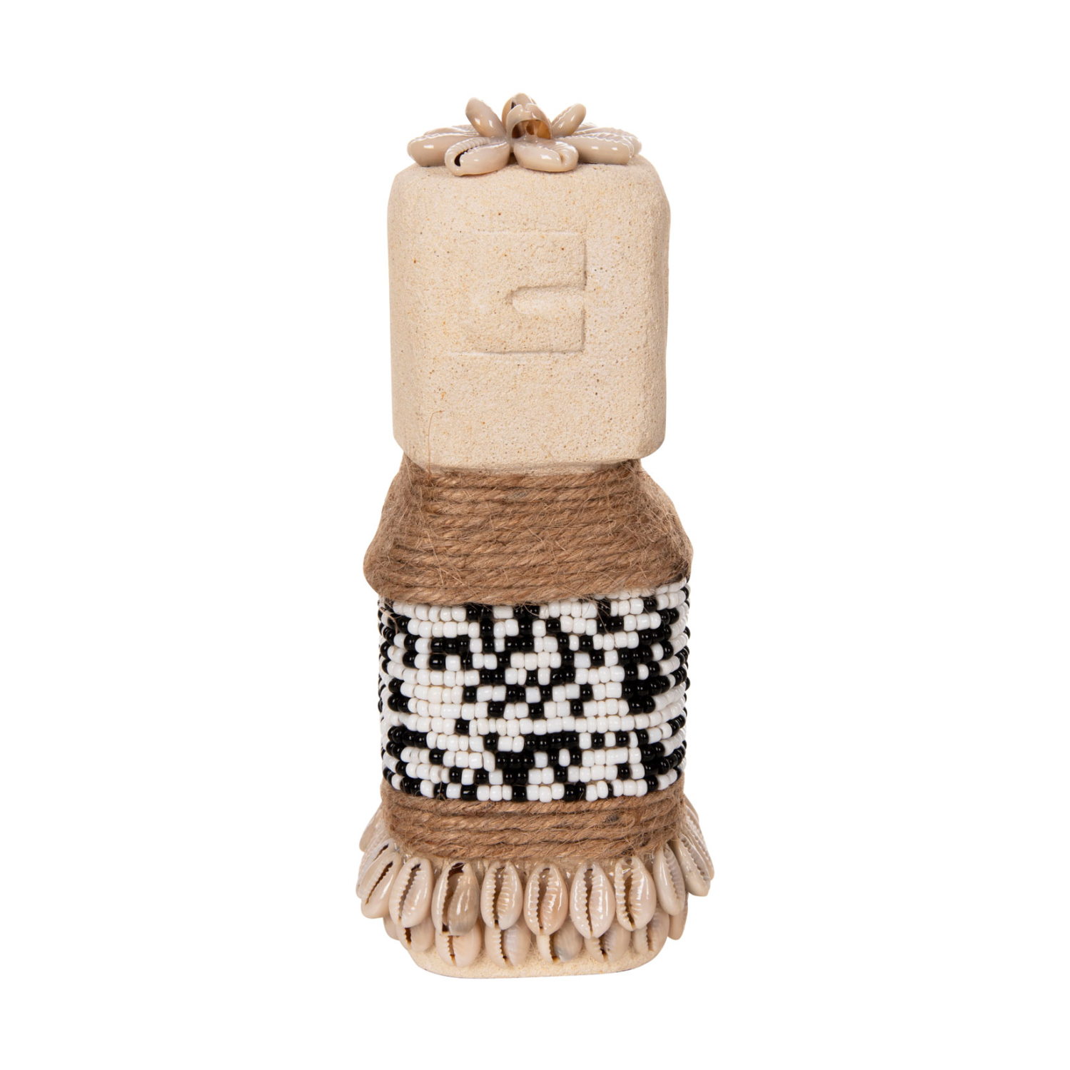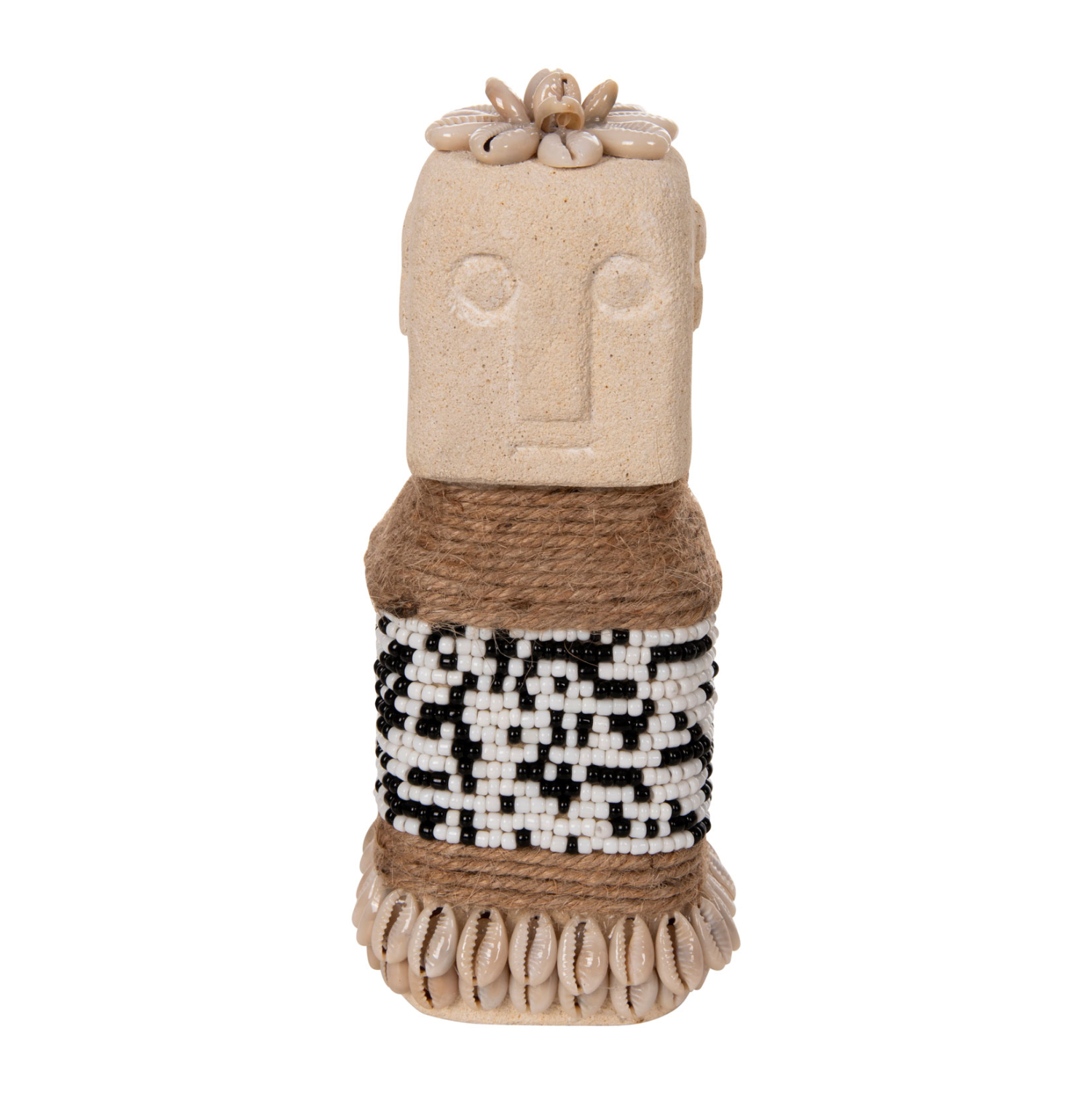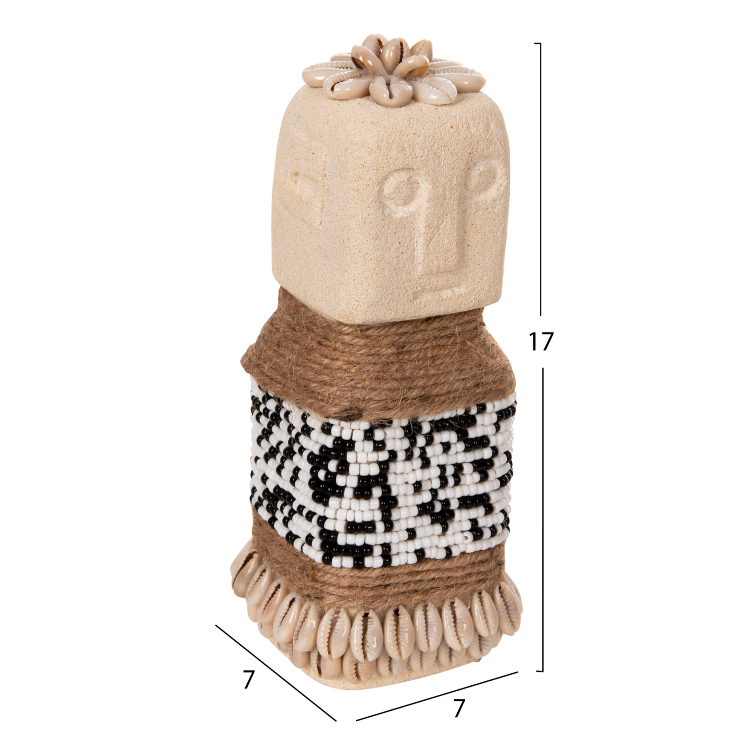 Το επιτραπέζιο διακοσμητικό FB94309 θα δώσει μια άλλη «αύρα» στον χώρο σας. Πρόκειται για ένα μακρόστενο αγαλματίδιο Πολυνησιακής τεχνοτροπίας (μορφή Μοάι), σε ΛΕΥΚΗ απόχρωση, διακοσμημένο με χάντρες και σχοινί από seagrass. Αυτό που κάνει όμως το ΗΜ4309 να ξεχωρίζει είναι η σημειολογία του. Είναι κατασκευασμένο από PARAS STONE, το οποίο στα ελληνικά αποδίδεται ως «τυχερή πέτρα» και λέγεται ότι φέρνει τύχη στον κάτοχό του. Προέρχεται από την Ινδική μυθολογία στην οποία το PARAS STONE είχε την ιδιότητα να μετατρέπει οποιοδήποτε αντικείμενο σε χρυσό.