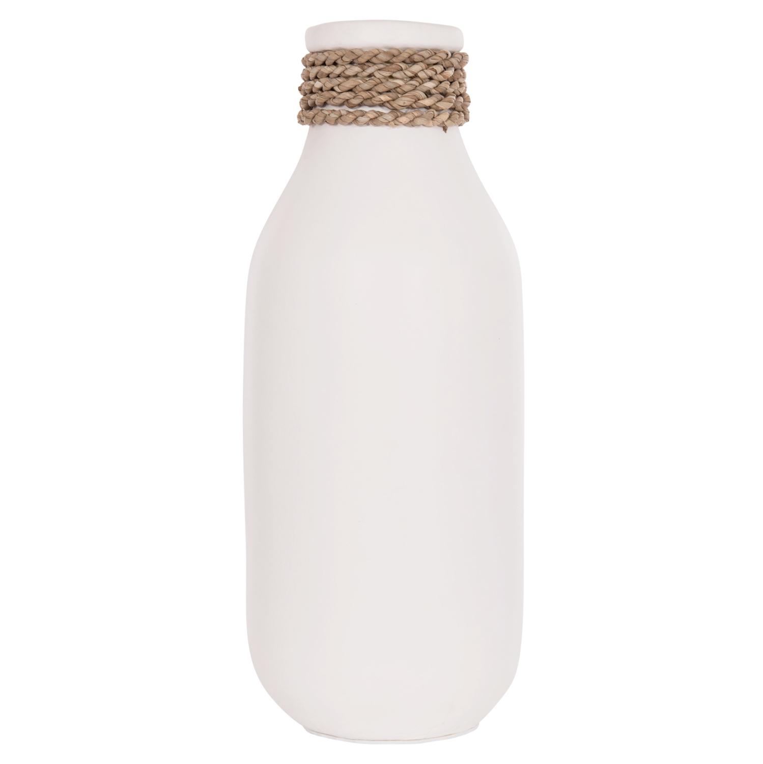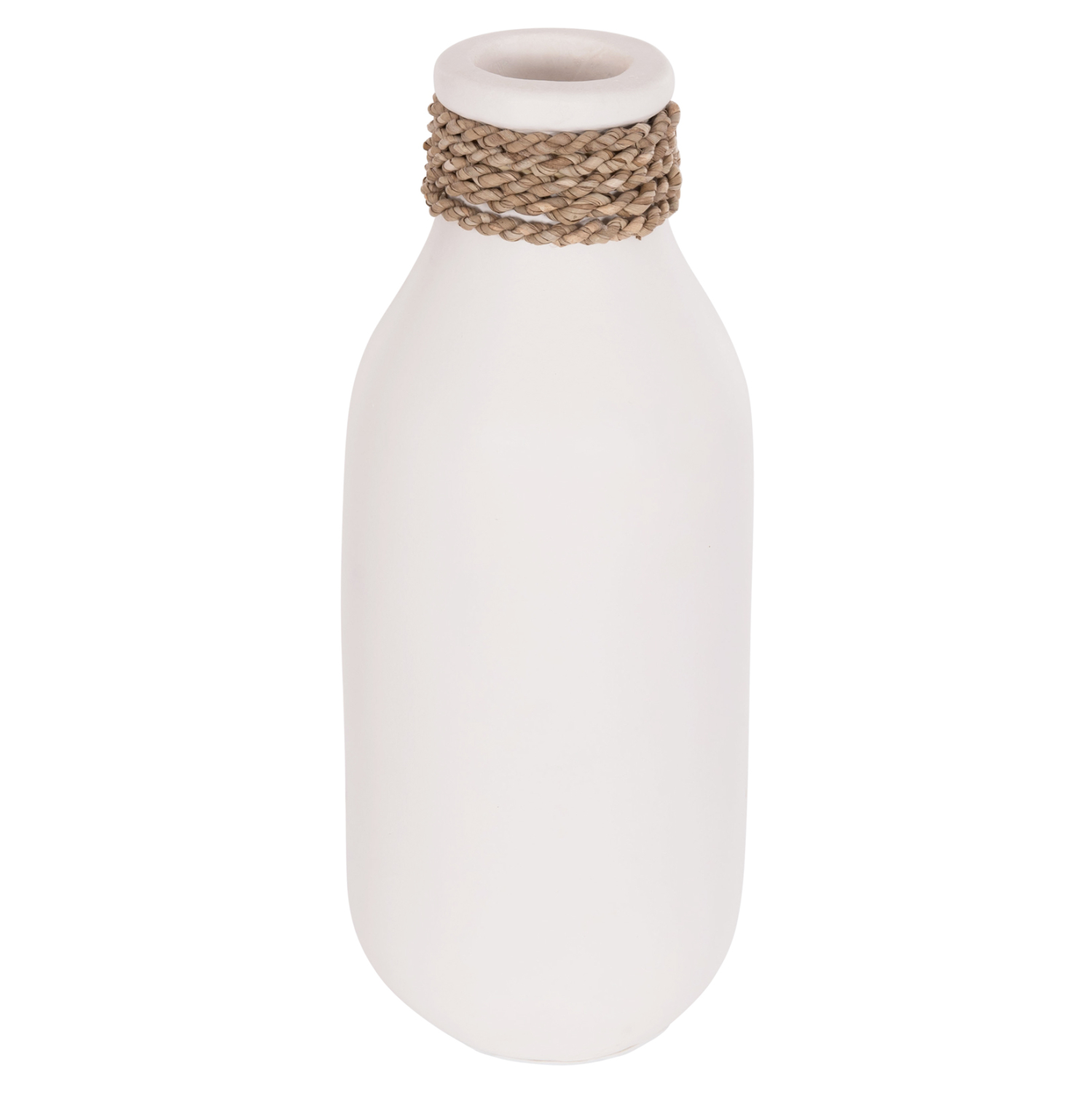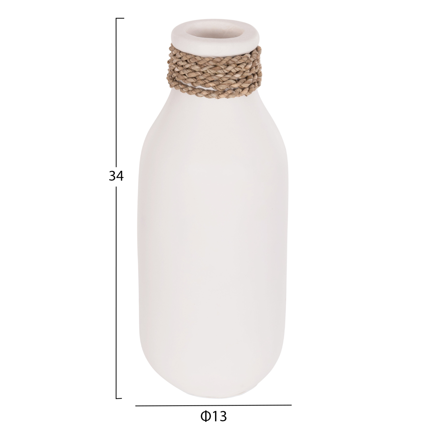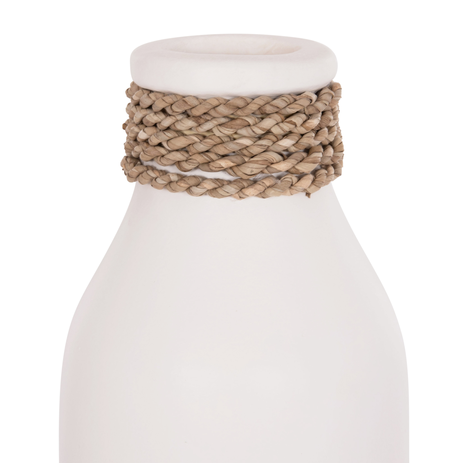 Το επιτραπέζιο χειροποίητο διακοσμητικό βάζο FB94687.02M έχει σχήμα μποτίλιας και είναι κατασκευασμένο εξολοκλήρου από τερακότα σε ΛΕΥΚΟ χρώμα ενώ διαθέτει διακοσμητική πλέξη από seagrass στον «λαιμό» ακριβώς κάτω από το στόμιο. Ιδανικό για πληθώρα χώρων, τόσο για το σπίτι, όσο και για επαγγελματικούς χώρους.