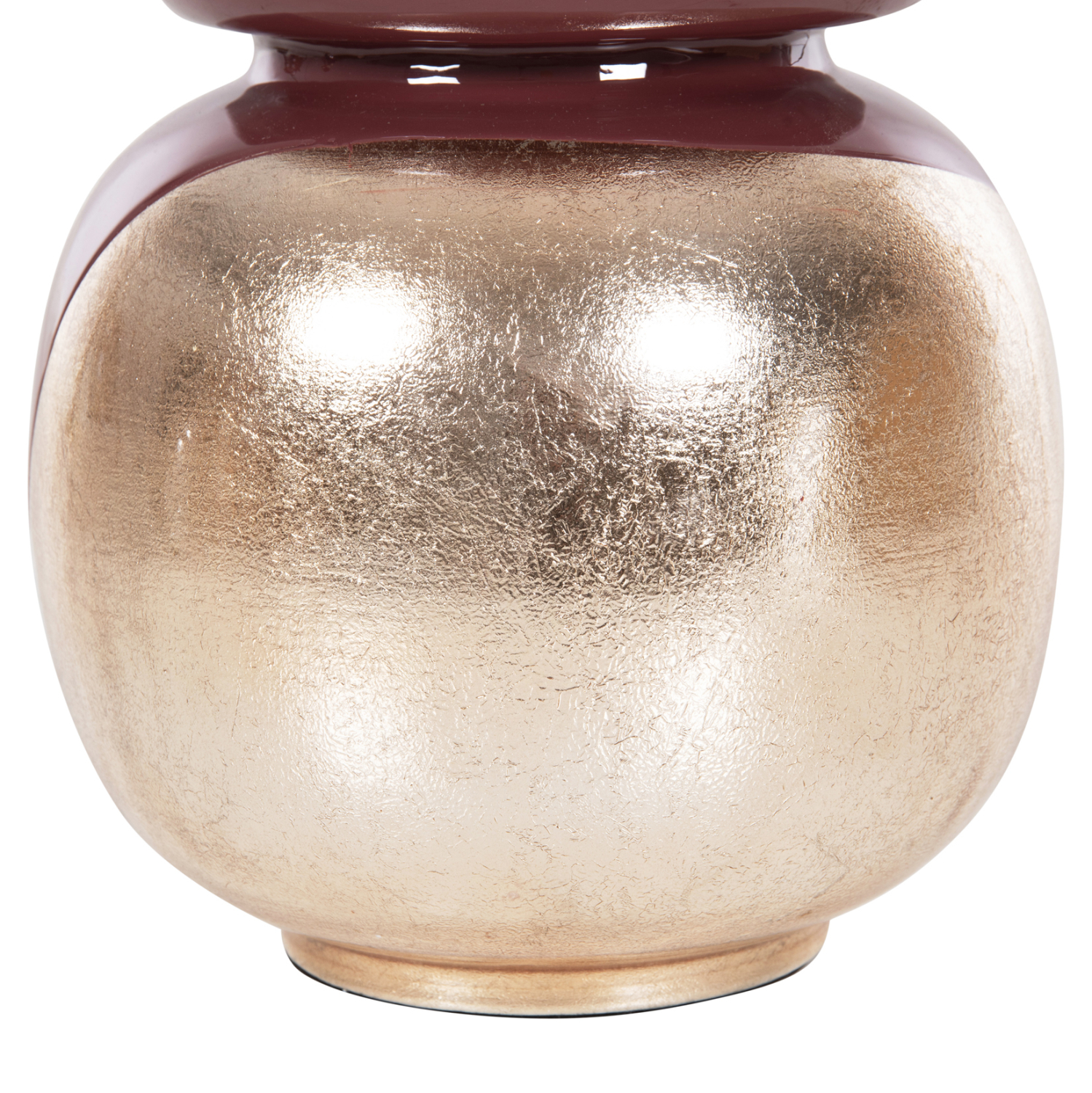Το διακοσμητικό επιτραπέζιο βάζο FB94233.06 είναι εξολοκλήρου μεταλλικό και αποτελείται από δύο μέρη. Την σχεδόν σφαιρική βάση και το βάζο με το μεγάλο στόμιο κολλημένο επάνω στην βάση. Το χρώμα του είναι ΚΕΡΑΣΙ με ΧΡΥΣΟ περιμετρικά στο στόμιο, ενώ η βάση είναι ΚΕΡΑΣΙ με ΧΡΥΣΟ περλέ χρώμα που αντανακλά το φως και δίνει ένα εντυπωσιακό και λαμπερό τελικό αποτέλεσμα. Αυτό το βάζο θα ομορφύνει κάθε χώρο είτε στο σπίτι είτε στον επαγγελματικό σας χώρο.
