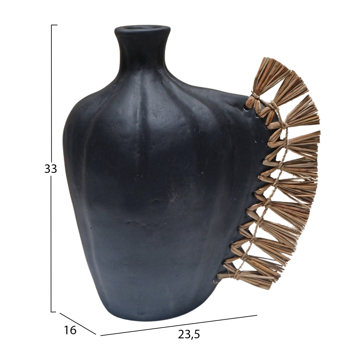 Το επιτραπέζιο χειροποίητο διακοσμητικό βάζο FB94689.01 διαθέτει στενό στόμιο και είναι ένα πολύ ιδιαίτερο διακοσμητικό στοιχείο για κάθε χώρο. Ακολουθώντας την τελευταία τάση στην εσωτερική διακόσμηση, είναι κατασκευασμένο εξολοκλήρου από σχεδόν σαγρέ τερακότα σε ΜΑΥΡΟ χρώμα, ενώ στην μία πλευρά διαθέτει διακόσμηση με αποξηραμένο grass.