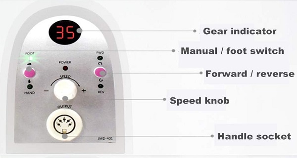 Χαρακτηριστικά: Μέγιστη ισχύς 60 Watt, Ταχύτητα 0-35.000 rpm, ρυθμιζόμενη, Ακρίβεια στην ρύθμιση στροφών, Ψηφιακή οθόνη, Τεχνολογία ελαχιστοποίησης θορύβου και κραδασμών, Ποδοδιακόπτης με δυνατότητα ρύθμισης στροφών ανάλογα την δύναμη πίεσης, Εξελιγμένο σύστημα καθυστέρησης 2” όταν γίνει αλλαγή της φοράς στροφών, για την προστασία του μοτέρ. Σύστημα προστασίας από την υπερθέρμανση και την υπερφόρτωση. Ειδικά σχεδιασμένα κουμπιά στο πάνελ για προστασία από σκόνη Εύκολη αφαίρεση και τοποθέτηση των αξεσουάρ με ένα απλό στρίψιμο του στυλό. Εργονομική χειρολαβή, Μέγιστη ροπή στυλό 4,5 Ncm, Διαστάσεις μονάδας: 19 x 15 x 6.5 cm. Περιλαμβάνεται σετ με 4 φρεζάκια.
