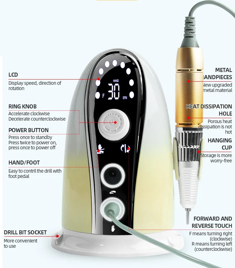 Επαγγελματικός ηλεκτρικός τροχός μανικιούρ-πεντικιούρ με βάση στήριξης. Διαθέτει ρυθμιζόμενη ταχύτητα, λειτουργία μειωμένου θορύβου και δονήσεων και εργονομικό σχεδιασμό για εύκολη και άνετη χρήση.