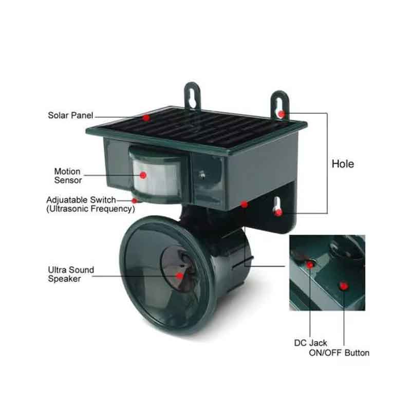 Εντοπίζει κίνηση μέσω αισθητήρα υπερύθρων και ενεργοποιεί υπερηχητικό ήχο που απομακρύνει γάτες, σκύλους, τρωκτικά και άλλα ζώα χωρίς να τα βλάπτει.