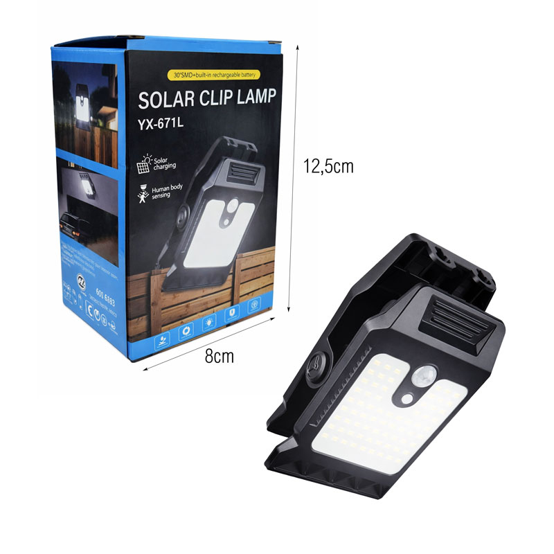 Ηλιακό φωτιστικό τοίχου τύπου clip, ιδανικό για εξωτερικούς χώρους όπως αυλές, μπαλκόνια, γκαράζ, φράχτες και εισόδους σπιτιών. Διαθέτει ενσωματωμένο ηλιακό πάνελ και επαναφορτιζόμενη μπαταρία, προσφέροντας αυτόνομη λειτουργία χωρίς καλώδια και ρεύμα. Ο αισθητήρας κίνησης ενεργοποιεί τον φωτισμό όταν ανιχνεύσει παρουσία, εξασφαλίζοντας οικονομία ενέργειας και αυξημένη ασφάλεια.