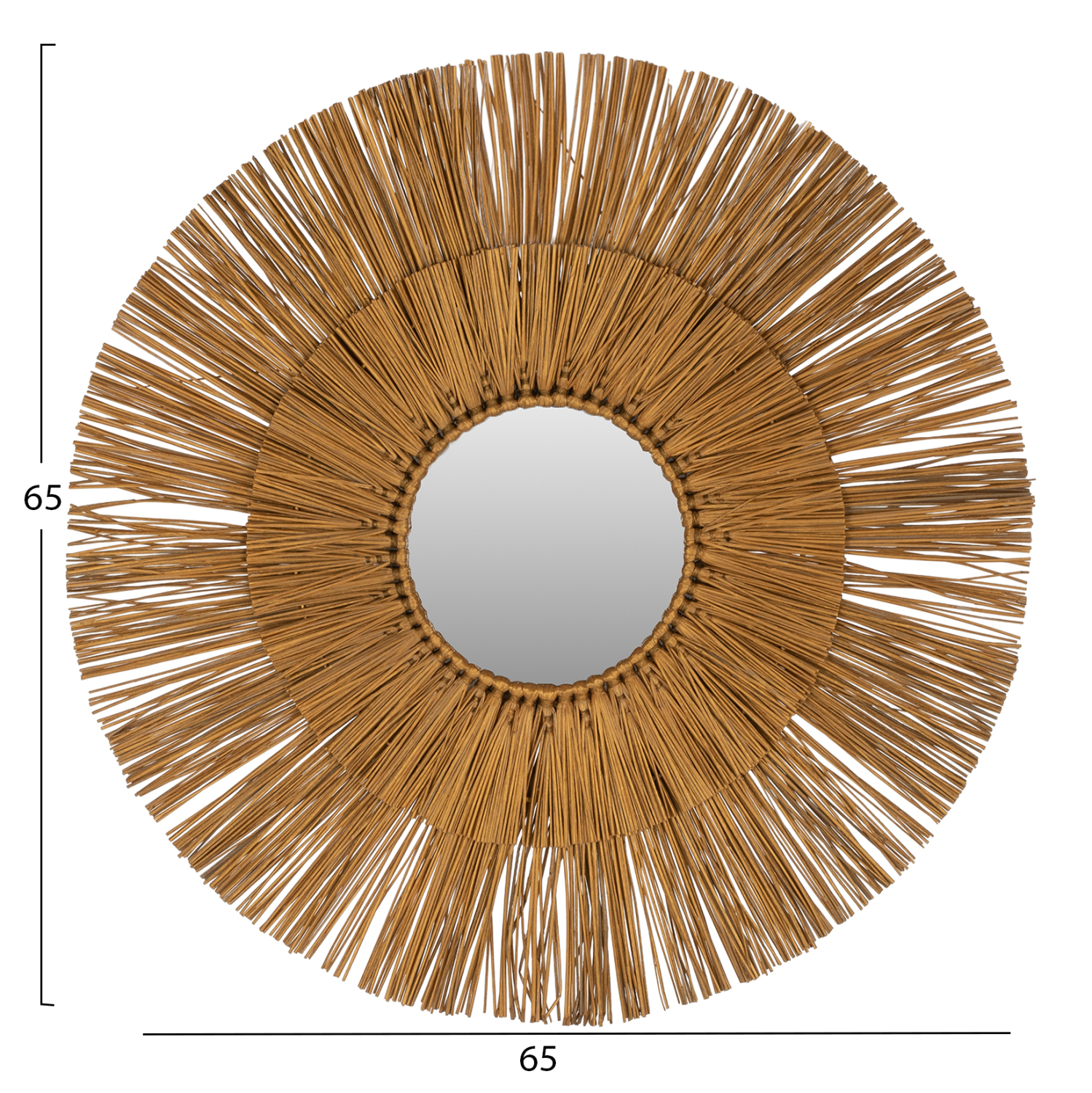 O καθρέπτης FB97801, είναι πραγματικά ένα εντυπωσιακό κομμάτι στην διακόσμηση του χώρου σας! Το design του είναι όμορφο με διπλό στρογγυλό πλαίσιο από το χόρτο Mendong, το οποίο στο κέντρο του «φιλοξενεί» τον καθρέπτη, ενώ είναι σε χρυσό χρώμα. Το χαρακτηριστικό είναι ότι ο καθρέφτης είναι μικρός και αποτελεί κυρίως διακοσμητικό στοιχείο.