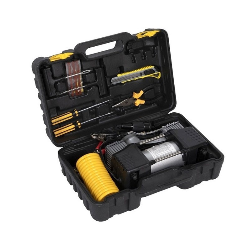 Περιλαμβάνει όλα όσα χρειάζεστε για γρήγορη επισκευή ελαστικού: εργαλείο σπείρας, εργαλείο εφαρμογής, ταινίες σφράγισης, κόφτη, μίνι κομπρεσέρ, σωλήνα, καλώδιο τροφοδοσίας και προστατευτική θήκη.
