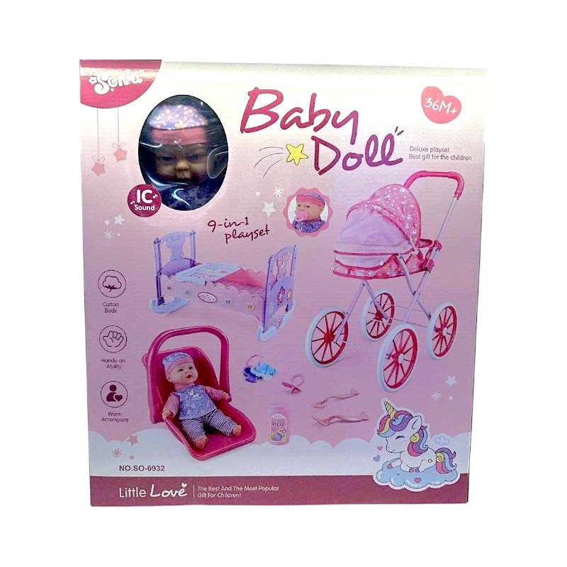Πλήρες σετ φροντίδας μωρού με κούκλα, κρεβατάκι, καρεκλάκι πορτ μπεμπέ, καροτσάκι και όλα τα απαραίτητα αξεσουάρ για την ολοκληρωμένη φροντίδα και την περιποίηση του μωρού σου!
