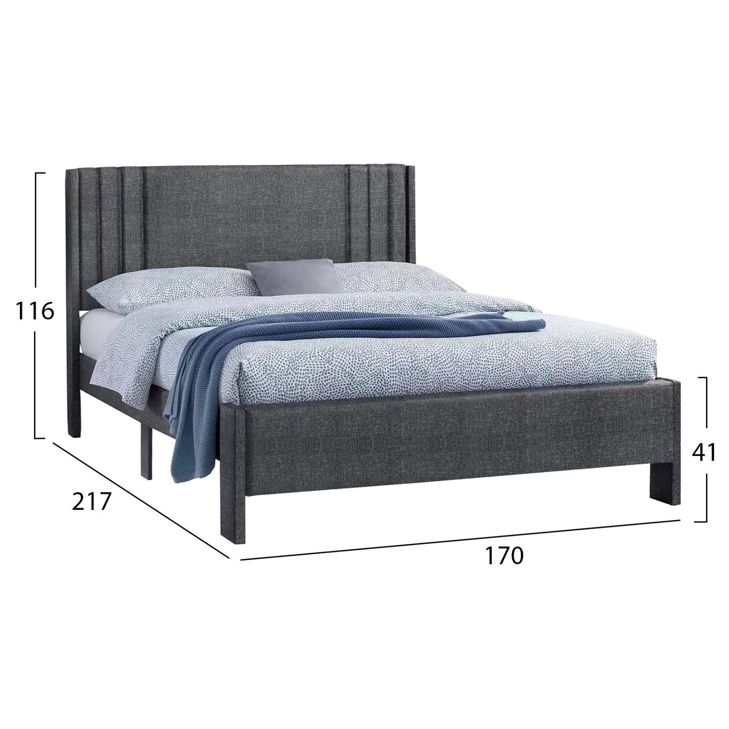 Το διπλό κρεβάτι FB9685.01 είναι ακόμα μια νέα προσθήκη στην γκάμα μας και θα χωρέσει κάθε σας «όνειρο». Το κεφαλάρι είναι ψηλό και επενδυμένο με καπιτονέ τεχνοτροπία σε κάθετες ραφές στις δύο άκρες. Όλη η επένδυση του κρεβατιού είναι από ανάγλυφο ύφασμα σε ΓΚΡΙ χρώμα και μπορεί να συνδυαστεί με πληθώρα διακοσμητικών μοτίβων. Το στρώμα τοποθετείται επάνω σε κλασικές τάβλες σομιέ που παρέχονται στην συσκευασία. Τέλος, το κρεβάτι διαθέτει και ακόμα δύο πόδια στην μέση του μήκους της τραβέρσας για μεγαλύτερη στιβαρότητα του κρεβατιού.