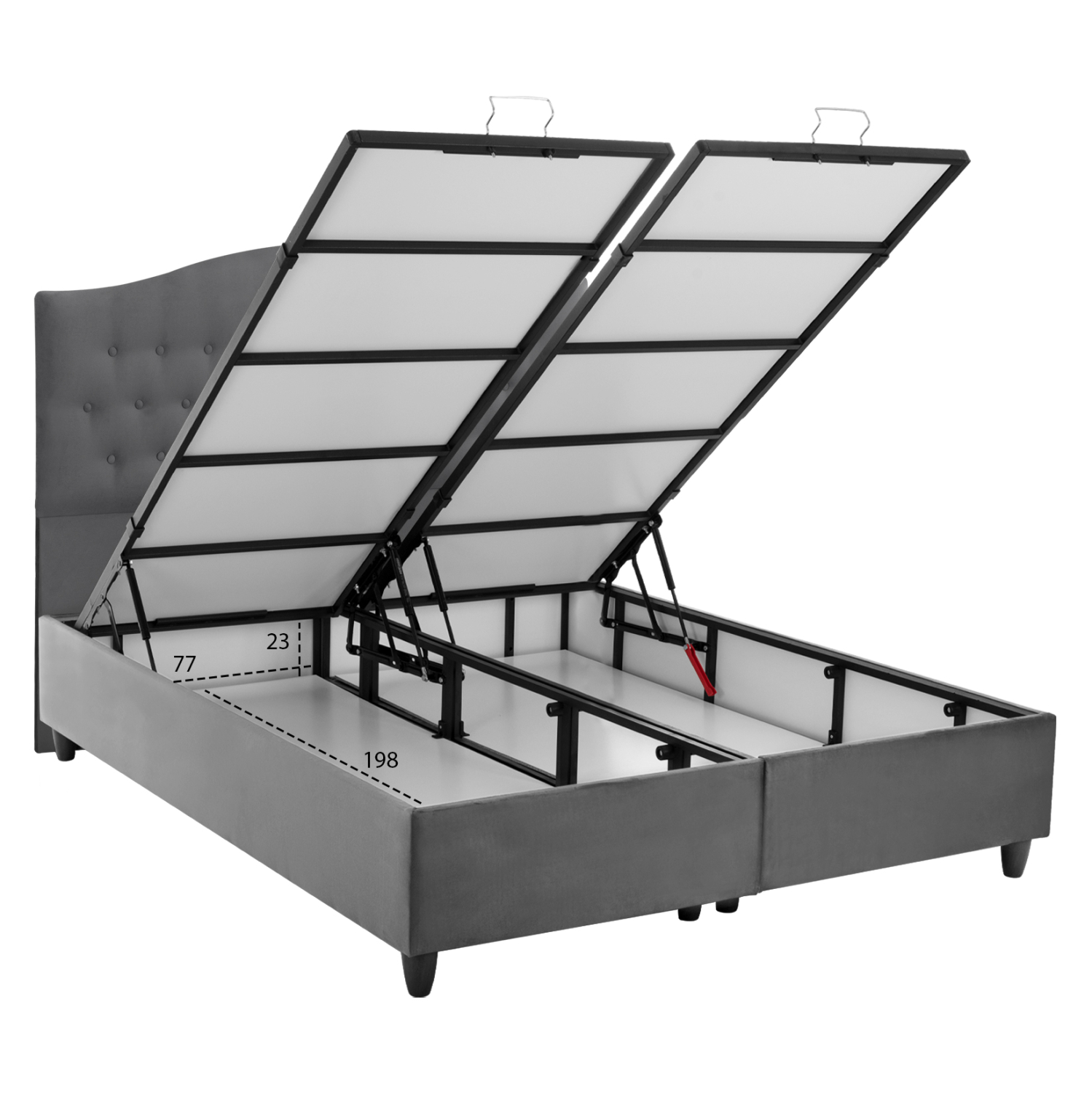 Επιπλέον, η κάθε επιφάνεια από μοριοσανίδα ανασηκώνεται με μεταλλικό μηχανισμό ασφαλείας με 4 αμορτισέρ και μεταλλικές λαβές προσφέροντας έναν μεγάλο αποθηκευτικό χώρο. Σε διαστάσεις στρώματος 160×200 εκ. θα χωρέσει κάθε σας όνειρο!
