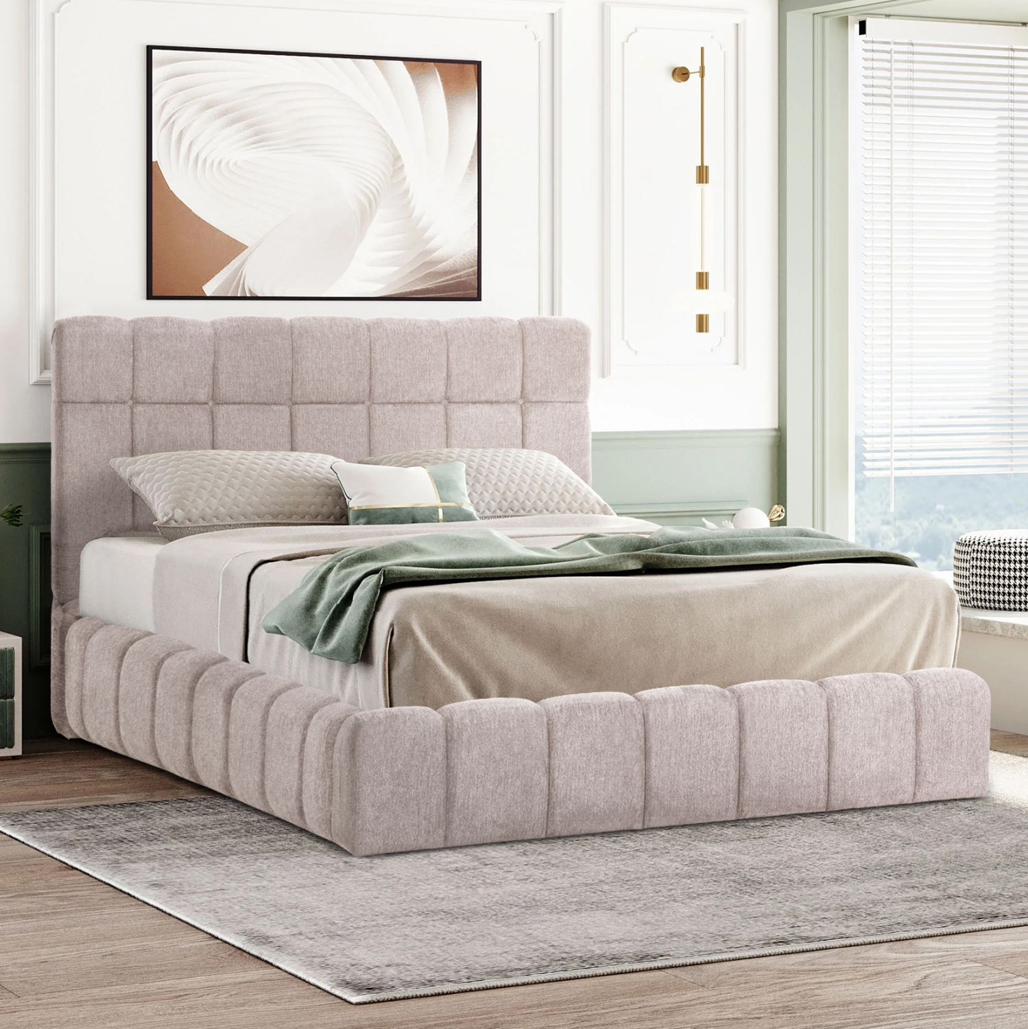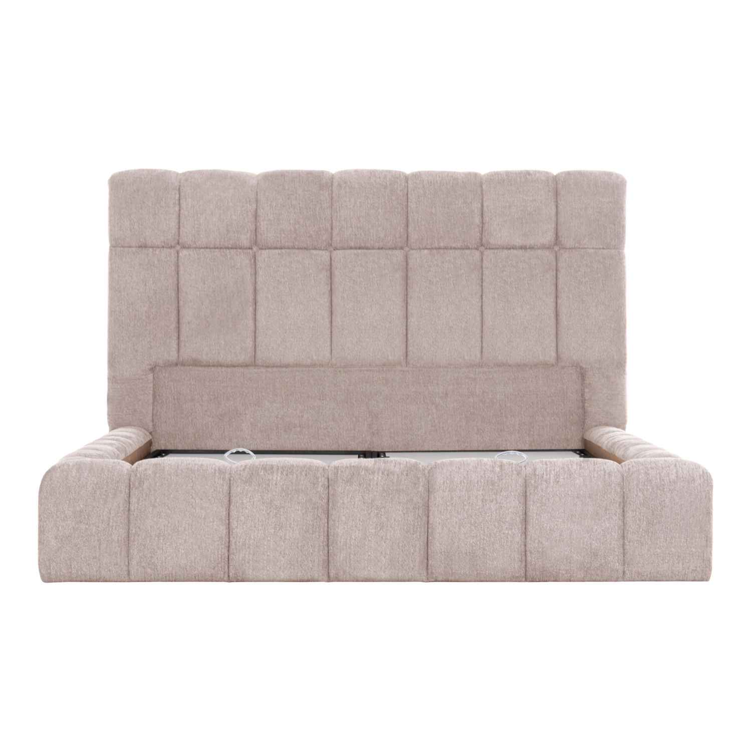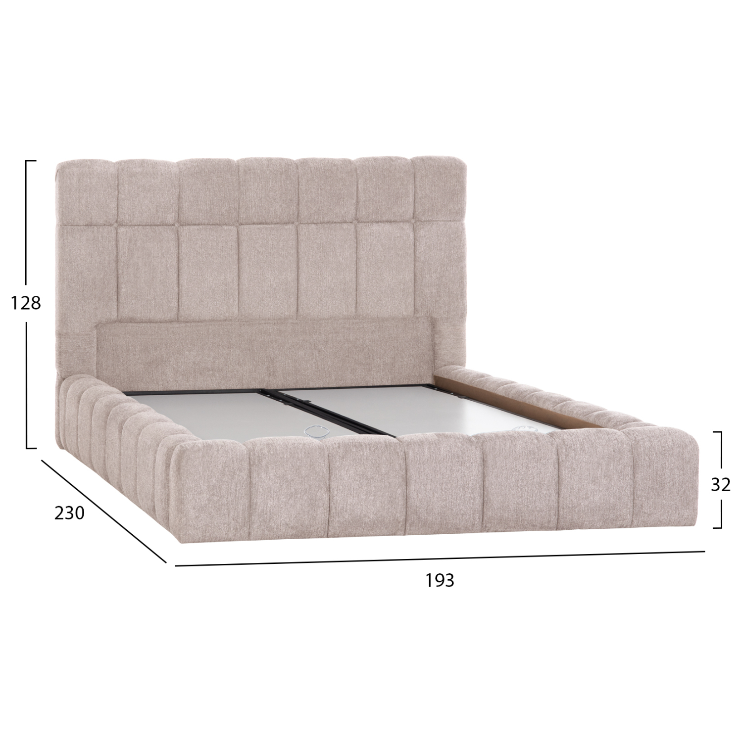 Το FB9720.10 είναι ένα κρεβάτι που θα αγαπήσετε με την πρώτη ματιά! Το κεφαλάρι είναι ψηλό με τεχνοτροπία καπιτονέ από «ζεστό» και εντυπωσιακό ύφασμα TEDDY σε ΜΠΕΖ χρώμα. Τα πλαϊνά του κρεβατιού αλλά και το ποδαρικό είναι ίδιας αισθητικής με το κεφαλάρι και «αγκαλιάζουν» το στρώμα! Όμως, το κύριο χαρακτηριστικό αυτού του κρεβατιού είναι ότι δεν ακολουθεί την κλασική κατασκευή με τις τάβλες του σομιέ για την στήριξη του στρώματος, αλλά αντίθετα αποτελείται από μια συνεχόμενη επιφάνεια (2 μοριοσανίδες), πάνω στις οποίες τοποθετείται το στρώμα! Επιπλέον, η κάθε επιφάνεια από μοριοσανίδα ανασηκώνεται με μεταλλικό μηχανισμό ασφαλείας με 4 αμορτισέρ και διαφανείς πλαστικές λαβές προσφέροντας έναν μεγάλο αποθηκευτικό χώρο. Σε διπλή διάσταση στρώματος 160×200 εκ. θα χωρέσει κάθε σας όνειρο!