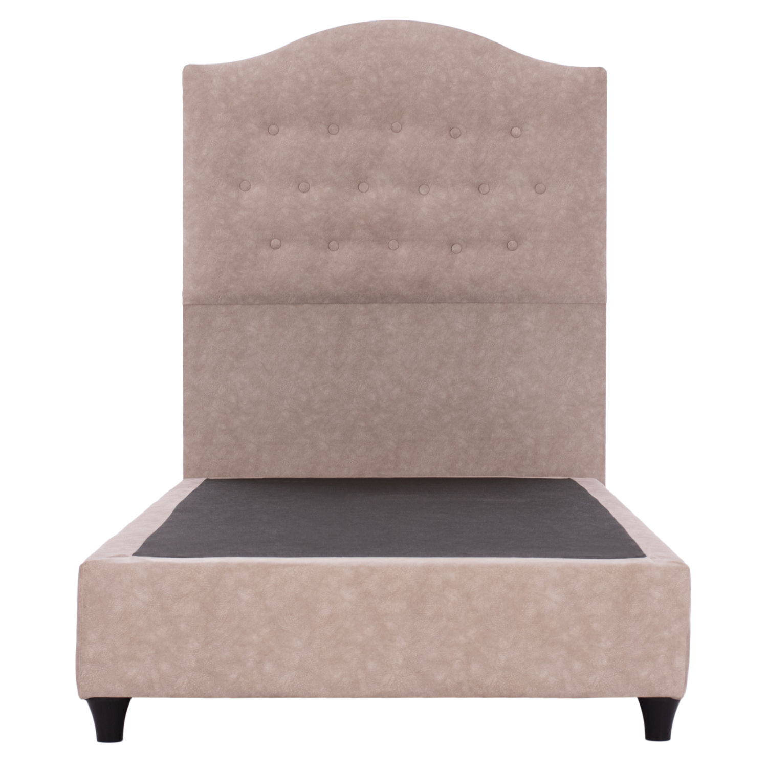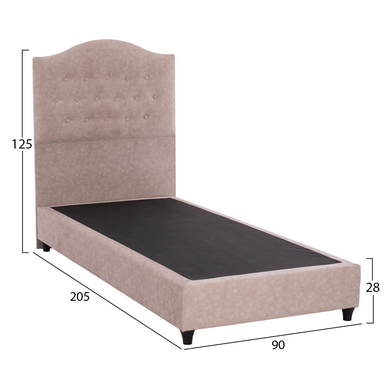 Το κρεβάτι αυτό έχει ψηλό κεφαλάρι, επενδυμένο με καπιτονέ τεχνοτροπία με τρούκς, ενώ και όλη η επένδυση του κρεβατιού είναι από βελούδινο ύφασμα. Το ΜΠΕΖ χρώμα σε όλο το κρεβάτι είναι ουδέτερο και μπορεί να συνδυαστεί με πληθώρα διακοσμητικών μοτίβων. Όμως, το κύριο χαρακτηριστικό αυτού του κρεβατιού είναι ότι δεν ακολουθεί την κλασική κατασκευή με τις τάβλες του σομιέ για την στήριξη του στρώματος, αλλά αντίθετα αποτελείται από μια συνεχόμενη επιφάνεια (2 μοριοσανίδες) επενδυμένη με αντιολισθητική φόδρα, πάνω στην οποία τοποθετείται το στρώμα. Σε διαστάσεις μονού στρώματος 90×200 εκ. ένα άτομο θα χωρέσει άνετα!