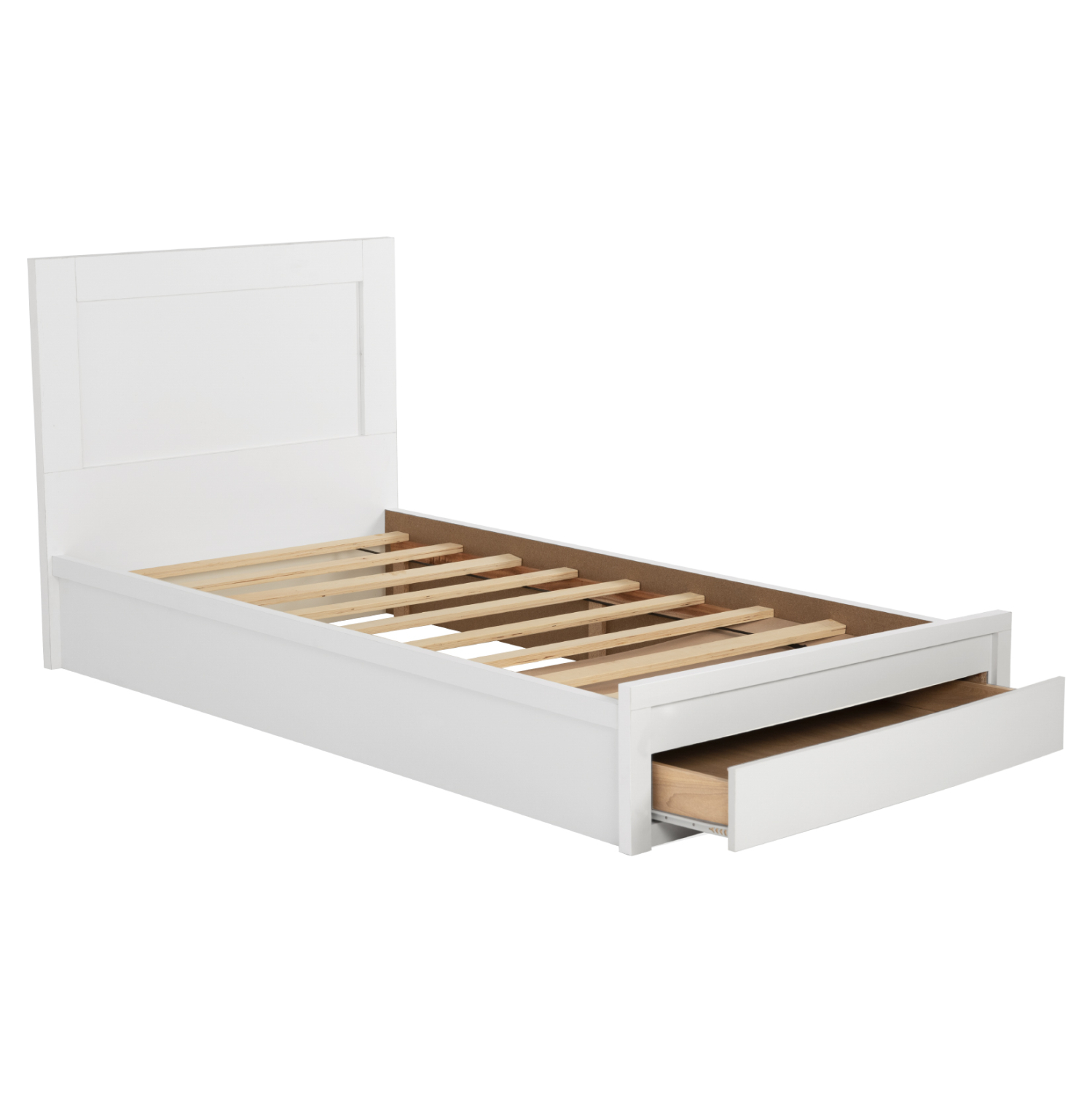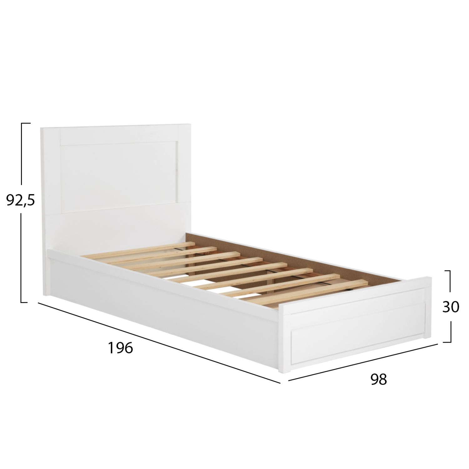 Το κρεβάτι FB9346.05 σε διάσταση για μονό στρώμα 90×190 εκ, είναι μια άριστης ποιότητας, κλασική και ασφαλής επιλογή που θα ταιριάξει σε κάθε υπνοδωμάτιο. Το χαρακτηριστικό του είναι ότι πατάει απευθείας στο δάπεδο και εκμεταλλεύεται τον χώρο κάτω από τις τάβλες του σομιέ με 1 μεγάλο συρτάρι που βγαίνει από την πλευρά του «ποδαρικού» (η επιφάνεια απέναντι από το κεφαλάρι). Όλες οι γωνίες είναι τετραγωνισμένες χωρίς καμία καμπύλη, ενώ το ΛΕΥΚΟ χρώμα είναι ευχάριστο και ουδέτερο, και μπορεί να συνδυαστεί με πληθώρα διακοσμητικών μοτίβων στον χώρο σας.