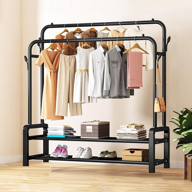 Κρεμάστρα δαπέδου μεταλλική, με 2 ράφια παπουτσιών και πλαϊνές κρεμάστρες, ιδανική ως έπιπλο εισόδου ή για την οργάνωση των ρούχων στο δωμάτιό σας.