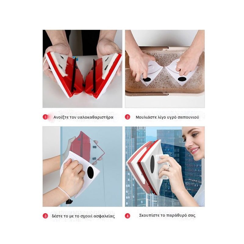 Μαγνητική συσκευή καθαρισμού τζαμιών – Double faced glass cleaner με ισχυρούς εσωτερικούς μαγνήτες κλειδώνει τις δύο πλευρές καθαρισμού μεταξύ τους, όταν μετακινείτε τη μία πλευρά, ακολουθεί η άλλη.
