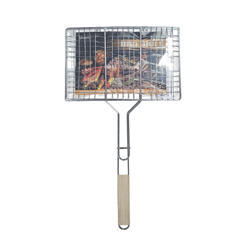 Ανθεκτική μεταλλική σχάρα ψησίματος, ιδανική για κρέας, ψάρι και λαχανικά. Διαθέτει ξύλινη λαβή για άνετο και ασφαλές κράτημα, καθώς και μηχανισμό κλειδώματος για σταθερό κράτημα των τροφών κατά το ψήσιμο. Κατάλληλη για χρήση σε κάρβουνα ή ψησταριά.