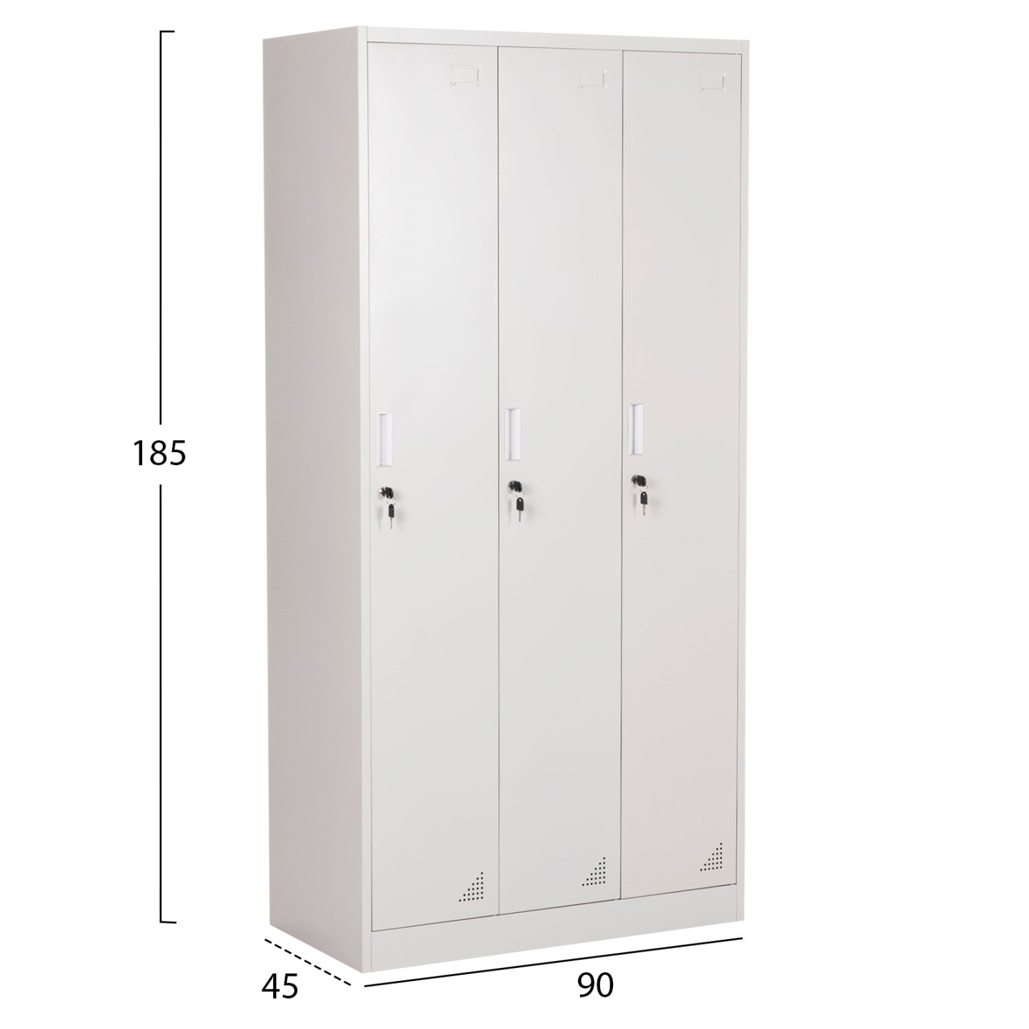 O FB95634.11 είναι ένας μεταλλικός φοριαμός με τρεις πόρτες (τριπλός) που κλειδώνουν με κλειδί. Απευθύνεται κυρίως σε επαγγελματικούς χώρους που χρειάζονται ένα τέτοιο έπιπλο. Το κάθε ντουλάπι/διαμέρισμα διαθέτει ένα ραφάκι στο επάνω μέρος, μια μεταλλική μπάρα για κρέμαση ρούχων, κι ένα ακόμα ραφάκι στο κάτω μέρος. Ακριβώς από κάτω, υπάρχει χώρος σαν παπουτσοθήκη και μάλιστα σε εκείνο το σημείο η πόρτα διαθέτει και γρίλιες για εξαερισμό. Το χρώμα είναι ΑΝΟΙΧΤΟ ΓΚΡΙ.