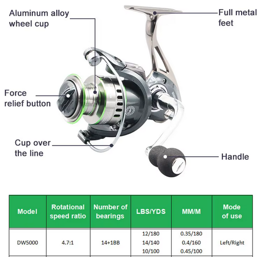 Υψηλής ποιότητας, μεταλλική κατασκευή από κράμα αλουμινίου, με μεγάλη αντοχή. Τεχνολογία ελαχιστοποίησης των κραδασμών και αποτροπής μπλεξίματος της πετονιάς. Με εναλλάξιμη λαβή δεξιά-αριστερή.