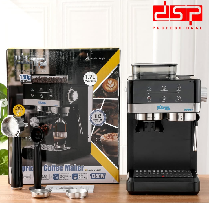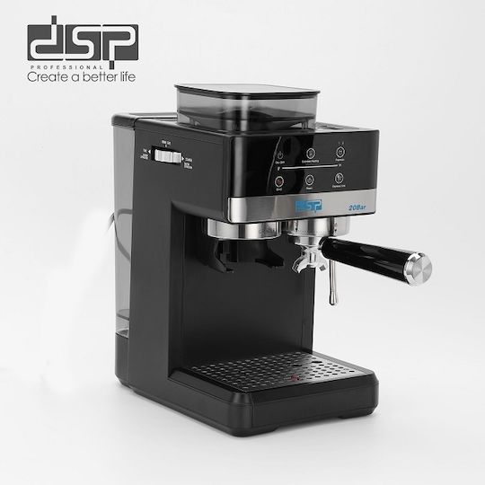 Μηχανή καφέ Espresso της DSP 2 σε 1 με ενσωματωμένο μύλο άλεσης. Υψηλής ποιότητας κατασκευή και απόδοση, ιδανική για επαγγελματικό καφέ espresso και ροφήματα στο σπίτι σας. Με ατσάλινο κλείστρο και ακροφύσιο αέρα από όπου μπορείτε να φτιάξετε εύκολα ζεστό αφρόγαλα, ζεστή σοκολάτα ή να ζεστάνετε άμεσα γάλα και ροφήματα.