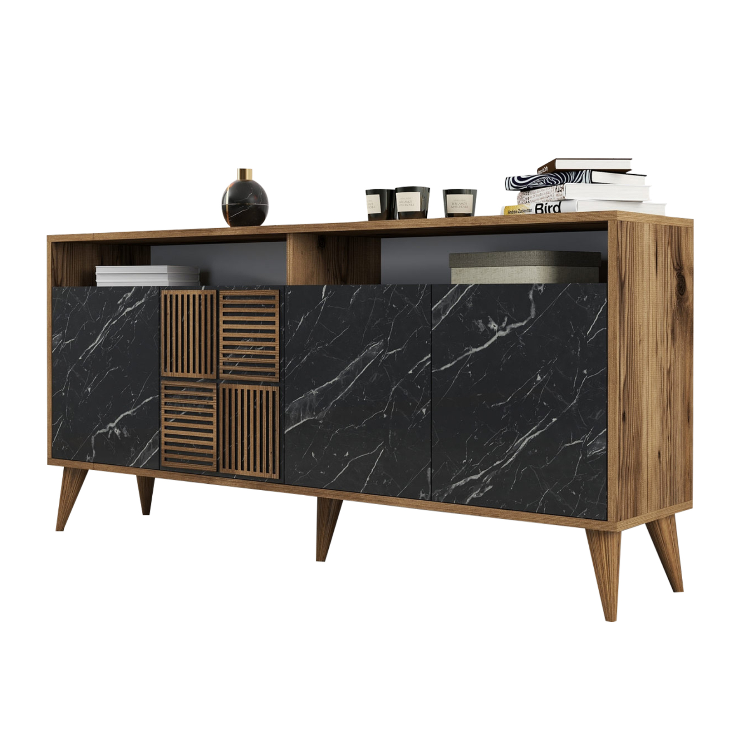 Ο μπουφές FB99506.02 είναι ένα επιβλητικό έπιπλο όπου κι αν τον τοποθετήσετε. Έχει ψηλά και πλαγιαστά πόδια σε καρυδί απόχρωση και δύο μεγάλα ντουλάπια με ράφι, που ανοίγουν με διπλές πόρτες. Ακριβώς επάνω από τα ντουλάπια και κάτω από την επάνω επιφάνεια υπάρχει ανοιχτός χώρος αποθήκευσης. Το μήκος του εξασφαλίζει ότι η επιφάνεια του είναι μεγάλη και αρκετή για τοποθέτηση πολλών αντικειμένων. Το χρώμα όλης της κατασκευής είναι καρυδί, ενώ όλες οι πόρτες έχουν εφέ ΜΑΥΡΟΥ μαρμάρου. Η μία πόρτα, μάλιστα, φέρει και καρυδί λεπτομέρειες. Ο μπουφές αυτός θα σας ενθουσιάσει! Τι είναι όμως ο μπουφές; Ο μπουφές είναι ένα άκρως πρακτικό έπιπλο, αφού στους αποθηκευτικούς του χώρους μπορούμε να βάλουμε από σερβίτσια πιάτων και ποτήρια, μέχρι κεριά και διάφορα άλλα χρηστικά αντικείμενα που έχουμε στο σπίτι μας, ώστε να είναι τακτοποιημένα και να μη δημιουργούν ακαταστασία στο χώρο.