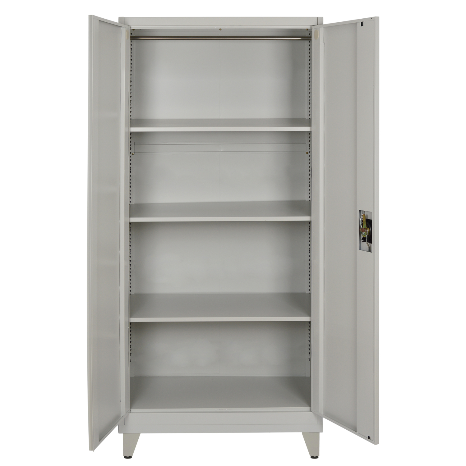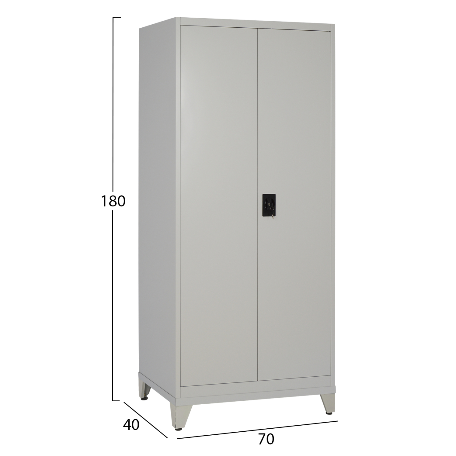 Η ντουλάπα διαθέτει δύο πόρτες με κλειδαριά για ασφαλή φύλαξη αντικειμένων και τρία ρυθμιζόμενα ράφια, ώστε να προσαρμόζεται εύκολα στις ανάγκες σας — ιδανική για εργαλεία, φακέλους, ρούχα ή εξοπλισμό. Επιπροσθέτως, διαθέτει και πόδια ύψους 10 εκατοστών με ρυθμιστές ύψους για εσάς που θέλετε η ντουλάπα να μην «πατάει» απευθείας στο δάπεδο.