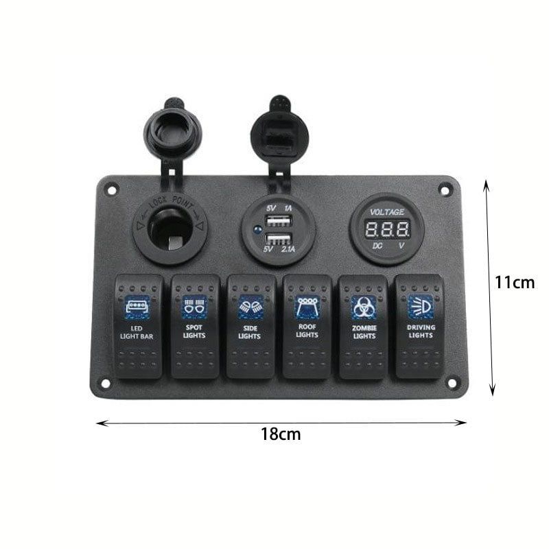 Πάνελ με 6 Αδιάβροχους Διακόπτες, Αναπτήρα, Βολτόμετρο, 2 X USB (Θαλάσσια Σκάφη/Αυτοκίνητα/Τρακτέρ)