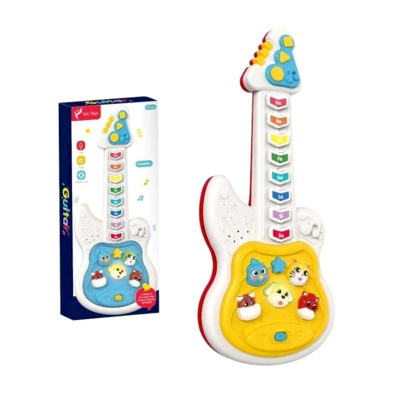 Παιδική ηλεκτρονική κιθάρα σε πανέμορφο πολύχρωμο σχεδιασμό, με εκπαιδευτικούς ήχους από νότες και ζωάκια. Διαθέτει ρυθμιζόμενο λουράκι ώμου.