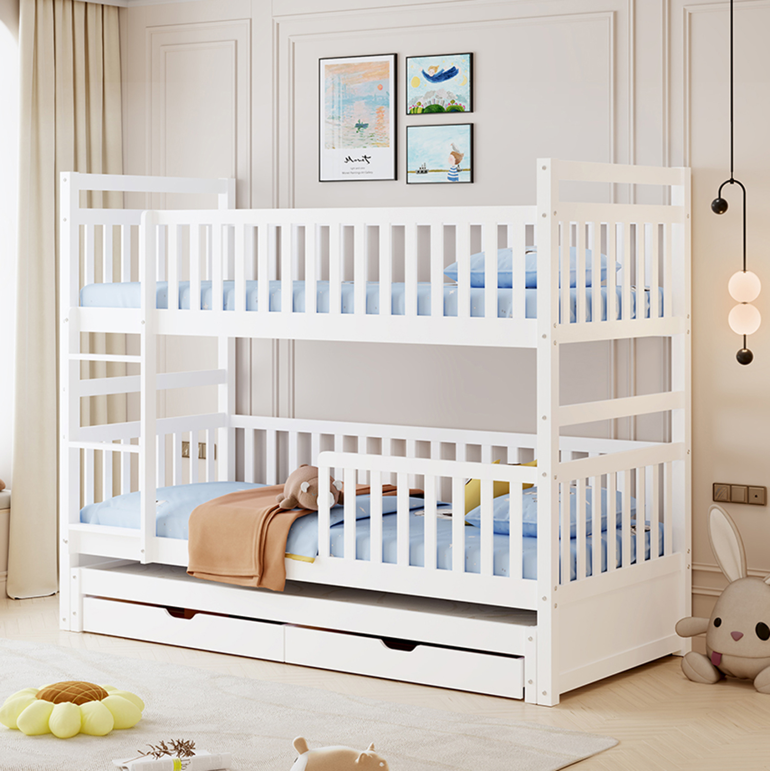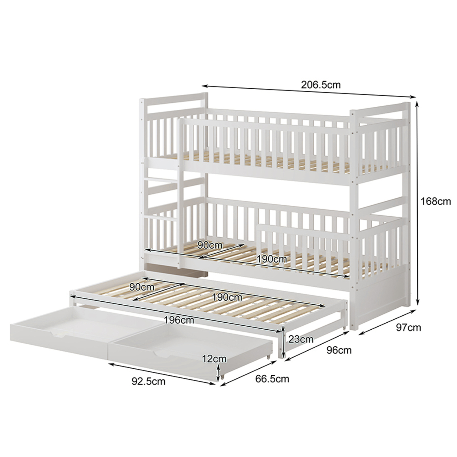 Σας παρουσιάζουμε το καινούργιο παιδικό κρεβάτι-κουκέτα FB9709.03 σε διάσταση για μονά στρώματα 90×190 & 200 εκ, και αποτελεί μια άριστης ποιότητας, μοντέρνα και ασφαλή επιλογή για το παιδικό δωμάτιο. Είναι ξύλινο σε ΛΕΥΚΟ χρώμα βαμμένο με αβλαβές μη τοξικό βερνίκι με βάση το νερό, ιδανικό για παιδιά. Τα στρώματα τοποθετούνται σε τάβλες κατασκευασμένες από ξυλεία κόντρα πλακέ. Η πρόσβαση στο επάνω κρεβάτι γίνεται με πρακτική κάθετη σκάλα, ενώ και τα δύο κρεβάτια διαθέτουν περιμετρικά κάγκελα. Ωστόσο, αυτή η κουκέτα ξεχωρίζει για το γεγονός ότι έχει και ένα ακόμα κρεβάτι που είναι συρόμενο και τοποθετείται στο κάτω μέρος της κουκέτας, όπως και 2 συρτάρια στα οποία μπορείτε να τοποθετήσετε οτιδήποτε χρειαστεί. Μια ιδανική πρόταση για σπίτια με περιορισμένο χώρο.