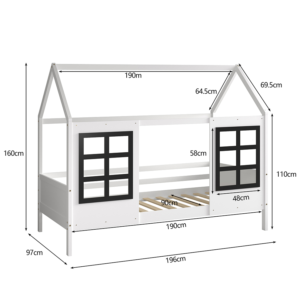 Το FB9742.01 είναι ακόμα ένα καινούργιο παιδικό κρεβάτι τύπου Montessori που σημαίνει ότι έχει σχεδιαστεί σύμφωνα με το εκπαιδευτικό σύστημα Montessori, κατά το οποίο τα παιδιά μαθαίνουν καλύτερα, όταν επιλέγουν μόνα τους τι θα κάνουν. Το κρεβάτι διαθέτει σχετικά ψηλά πόδια, και είναι σε διάσταση για μονό στρώμα 90×190 εκ, αποτελώντας μια άριστης ποιότητας, μοντέρνα και ασφαλή επιλογή για το παιδικό δωμάτιο. Είναι ξύλινο σε ΛΕΥΚΟ χρώμα βαμμένο με αβλαβές μη τοξικό βερνίκι με βάση το νερό, ιδανικό για παιδιά. Το στρώμα τοποθετείται σε τάβλες κατασκευασμένες από ξυλεία κόντρα πλακέ. Ολόκληρο το κρεβάτι έχει σχήμα σπιτιού με 2 παραθυράκια σε ΜΑΥΡΟ χρώμα, που θα δώσει μια ευχάριστη, «ζεστή», και παιχνιδιάρικη όψη σε κάθε παιδικό δωμάτιο.