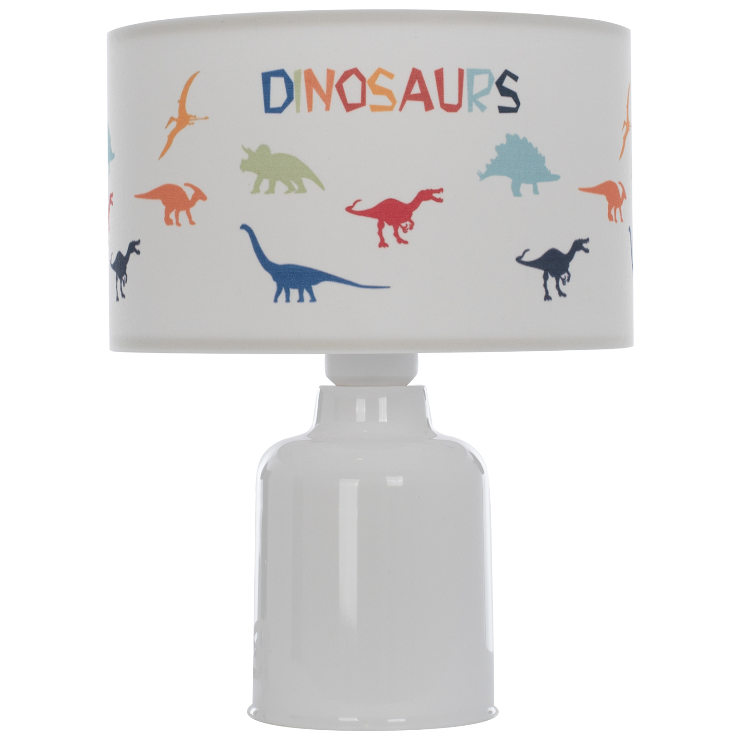 FB97577.05-ΠΑΙΔΙΚΟ επιτραπέζιο φωτιστικό——- Φωτίστε το παιδικό δωμάτιο του σπιτιού με το ευέλικτο επιτραπέζιο φωτιστικό με τον λευκό πλαστικό κορμό και το κυλινδρικό «καπέλο» με πολύχρωμες φιγούρες δεινοσαύρων, που πάντα εξάπτουν την φαντασία των παιδιών. Ο απαλός φωτισμός που προσφέρει θα γίνει ο καλύτερος σύντροφος των παιδιών τις νυχτερινές ώρες.