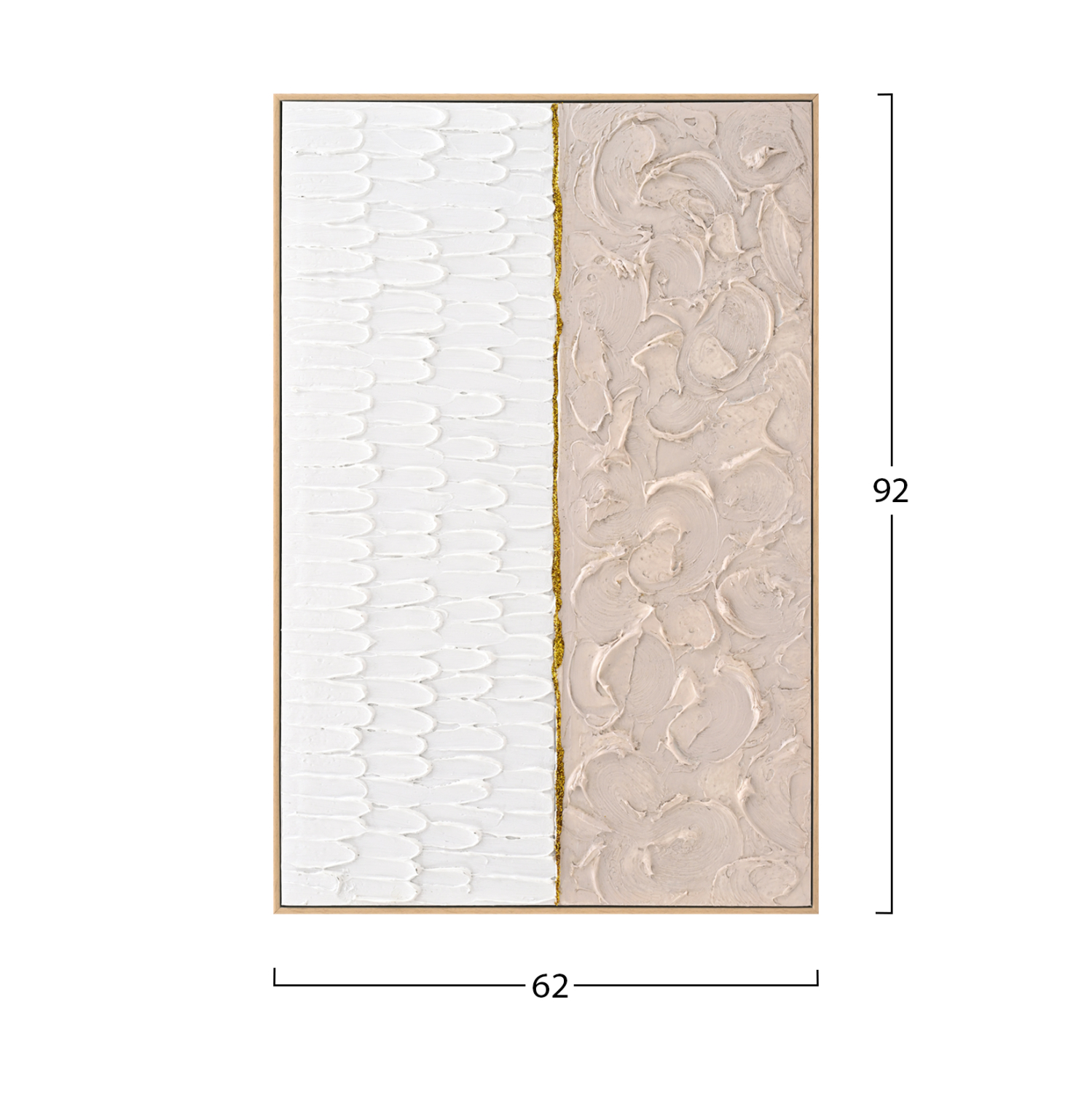 Ανάμεσα σε όλα τα διακοσμητικά στοιχεία, τα έργα τέχνης και ειδικά οι πίνακες ζωγραφικής παίζουν εξέχοντα ρόλο: όχι μόνο προσθέτουν χρώμα και αισθητική ομορφιά, αλλά δίνουν επίσης βάθος και νόημα στον χώρο μας. Ένας πίνακας μεταμορφώνει τον τρόπο που αντιλαμβανόμαστε έναν χώρο. Διακοσμήστε, λοιπόν, τον χώρο σας με έναν από τους καινούργιους πίνακες που προστέθηκαν στην γκάμα μας! Αυτός ο πίνακας είναι ζωγραφισμένος 100% με το χέρι και είναι χωρισμένος στην μέση με τις δύο πλευρές να είναι σε ΜΠΕΖ και ΛΕΥΚΟ αντίστοιχα. Η κορνίζα είναι ΜΠΕΖ από πολυστυρένιο.