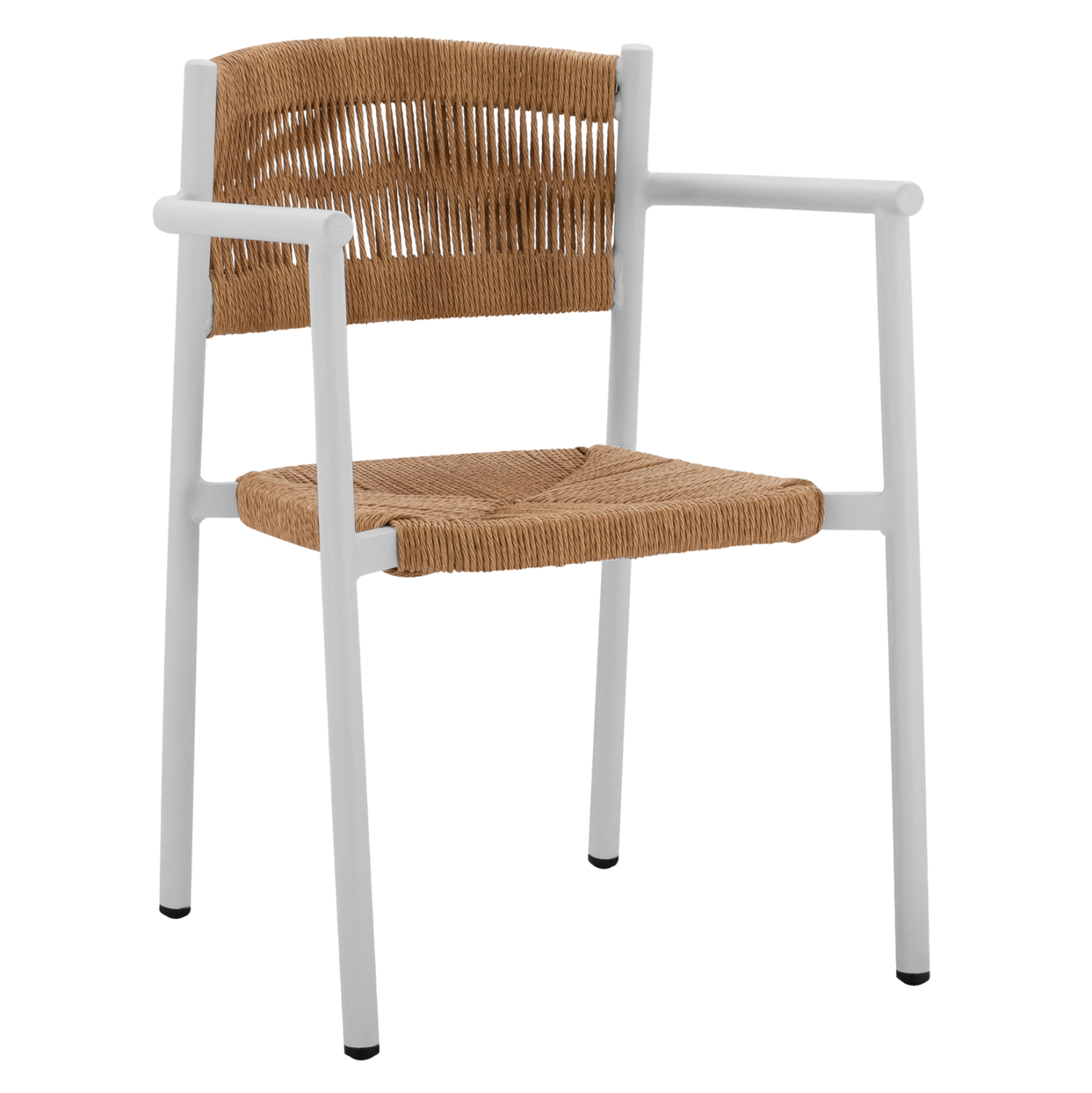Μοντέρνα πολυθρόνα, κατασκευασμένη από σκελετό αλουμινίου σε λευκή απόχρωση, επενδυμένημε πλεκτό ενισχυμένο PE σχοινί στο κάθισμα και στην πλάτη σε μπεζ απόχρωση.