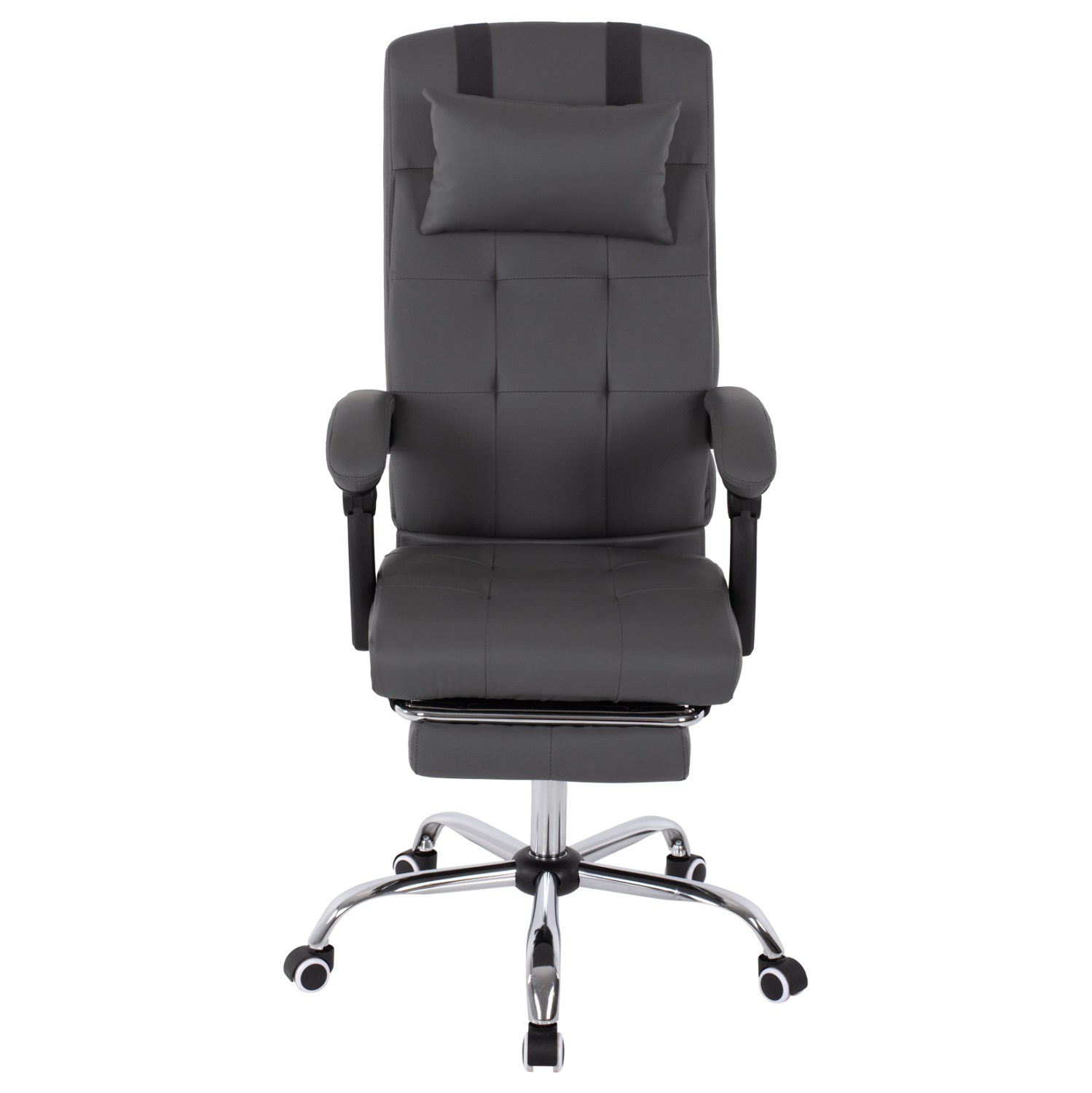 FB91057.20–Διευθυντική καρέκλα γραφείου σε ΓΚΡΙ χρώμα. Μια «πλούσια» και επιβλητική καρέκλα γραφείου με αναπαυτικά μπράτσα με εργονομική κλίση επενδυμένα με μαξιλαράκια. Η πλάτη είναι πολύ ψηλή ενώ έχει πλούσια στρώση από αφρώδη υλικά και έξτρα μαξιλαράκι στο επάνω μέρος της πλάτης για μεγαλύτερη άνεση κατά την χρήση. Υποστηρίζει ολόκληρο τον κορμό σας, ενώ είναι επενδυμένη με υψηλής ποιότητας PU δέρμα με καπιτονέ τεχνοτροπία, όπως επίσης και το φαρδύ και αναπαυτικό κάθισμα με την εξτρά αναπαυτική επιφάνεια. Η βάση είναι χρωμιωμένη σε σχήμα «αστέρι» με κυρτά πόδια και ασπρόμαυρα ροδάκια. Το χαρακτηριστικό, όμως, που κάνει αυτή την καρέκλα να ξεχωρίζει είναι ότι διαθέτει πτυσσόμενο υποπόδιο, το οποίο σε συνδυασμό με το γεγονός ότι η πλάτη «πέφτει» με μεγάλη κλίση, σας επιτρέπει να ξαπλώνετε και να ξεκουράζεστε όταν το επιθυμείτε!