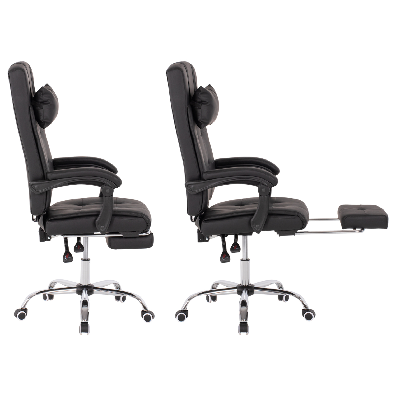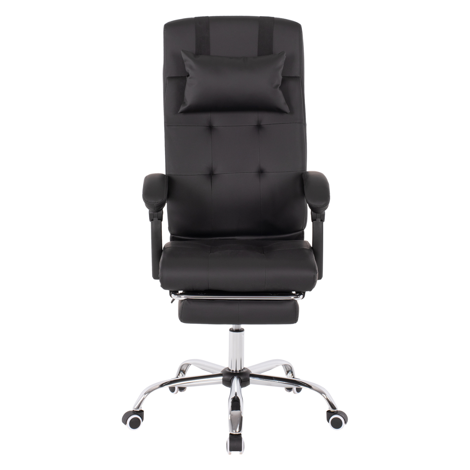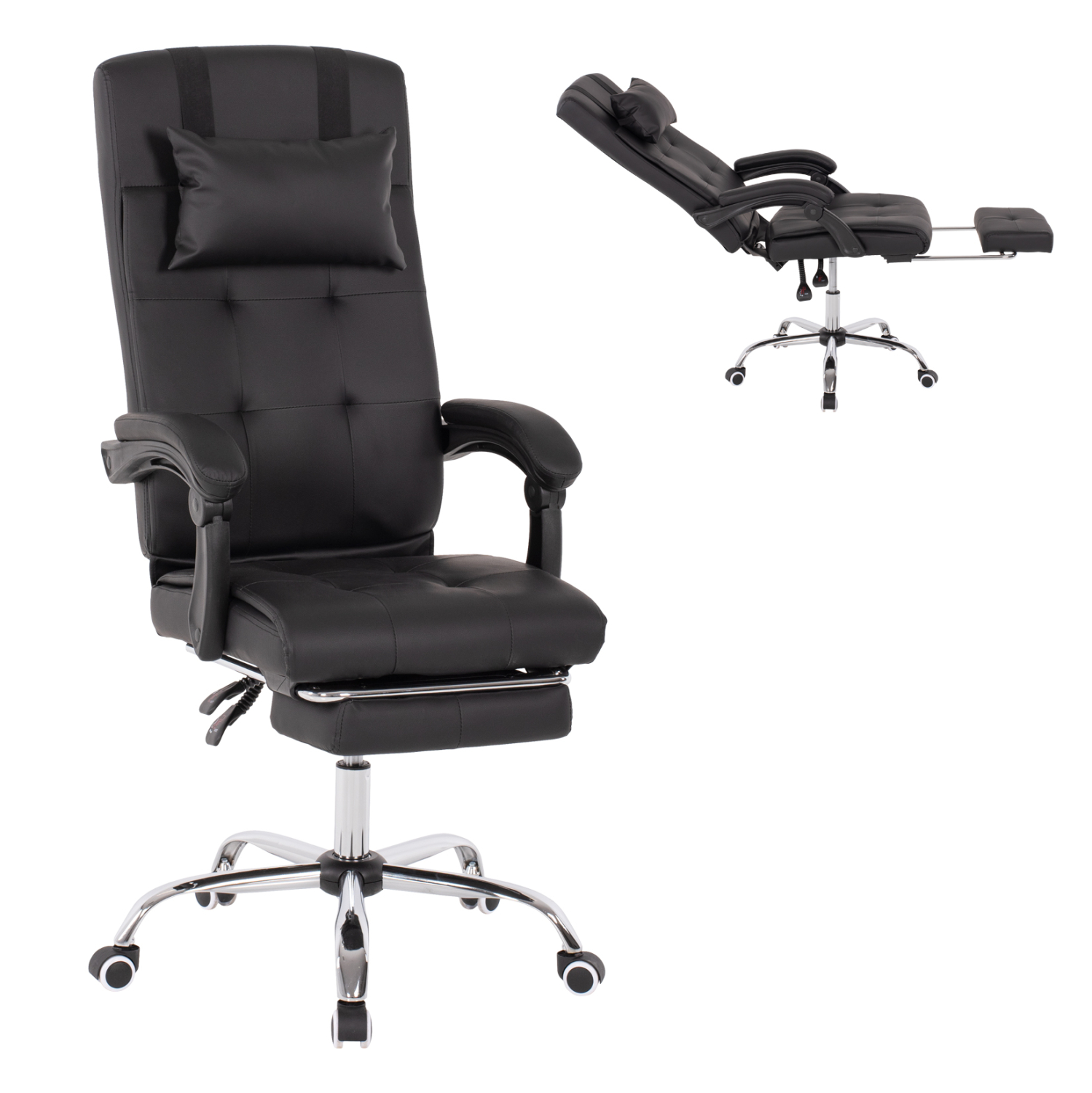 FB91057.11–Διευθυντική καρέκλα γραφείου σε ΜΑΥΡΟ χρώμα. Μια «πλούσια» και επιβλητική καρέκλα γραφείου με αναπαυτικά μπράτσα με εργονομική κλίση επενδυμένα με μαξιλαράκια. Η πλάτη είναι πολύ ψηλή ενώ έχει πλούσια στρώση από αφρώδη υλικά και έξτρα μαξιλαράκι στο επάνω μέρος της πλάτης για μεγαλύτερη άνεση κατά την χρήση. Υποστηρίζει ολόκληρο τον κορμό σας, ενώ είναι επενδυμένη με υψηλής ποιότητας PU δέρμα με καπιτονέ τεχνοτροπία, όπως επίσης και το φαρδύ και αναπαυτικό κάθισμα με την εξτρά αναπαυτική επιφάνεια. Η βάση είναι χρωμιωμένη σε σχήμα «αστέρι» με κυρτά πόδια και ασπρόμαυρα ροδάκια. Το χαρακτηριστικό, όμως, που κάνει αυτή την καρέκλα να ξεχωρίζει είναι ότι διαθέτει πτυσσόμενο υποπόδιο, το οποίο σε συνδυασμό με το γεγονός ότι η πλάτη «πέφτει» με μεγάλη κλίση, σας επιτρέπει να ξαπλώνετε και να ξεκουράζεστε όταν το επιθυμείτε!