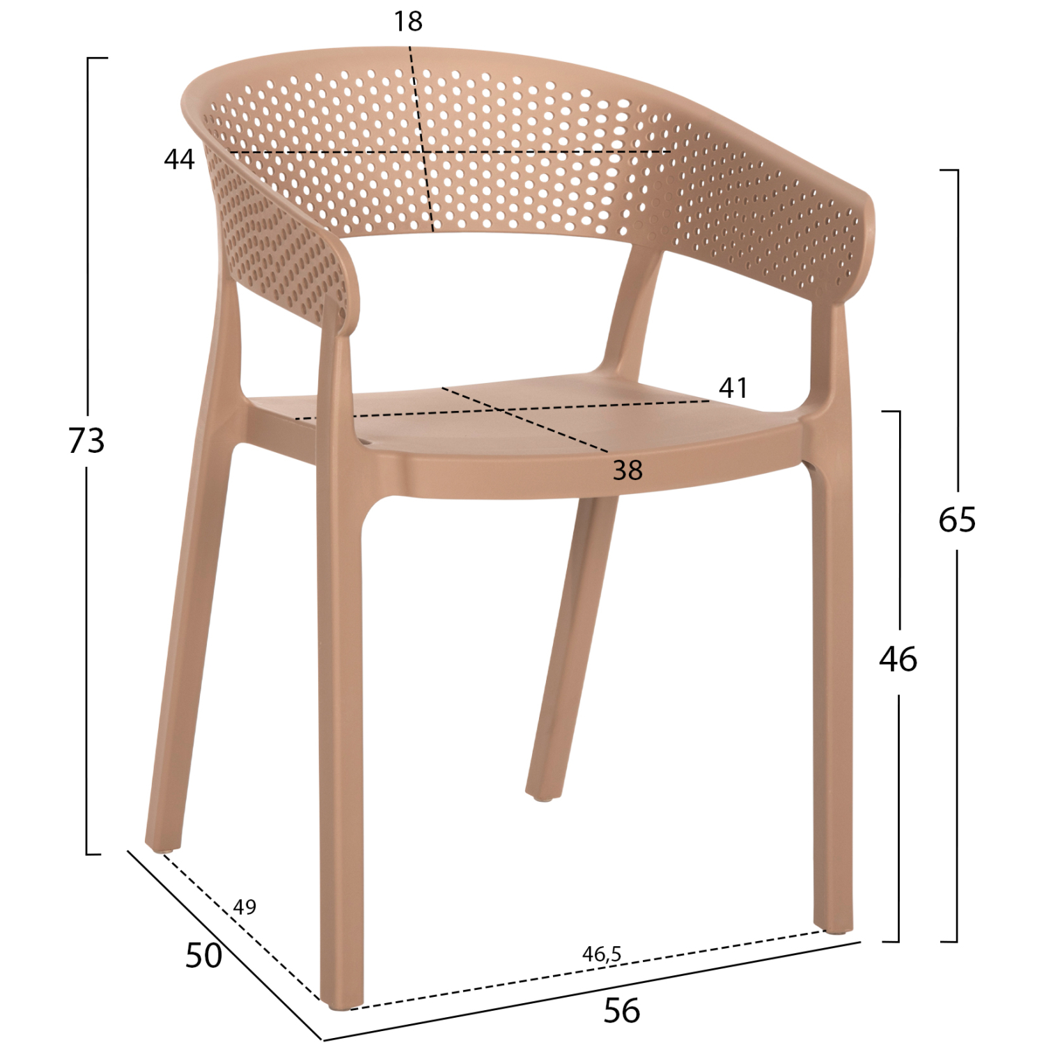 FB95941.03–Πολυθρόνα πολυπροπυλενίου σε ΚΑΠΟΥΤΣΙΝΟ χρώμα. Ιδανική πρόταση για χρήση σε εξωτερικούς χώρους, είτε επαγγελματικούς (χώροι δεξιώσεων, εταιρείες catering, κλπ.) είτε για το σπίτι. Η πολυθρόνα αποτελείται από ένα λείο κάθισμα και μια ημικυκλική, ανεξάρτητη και «τρυπητή» πλάτη και μπράτσα. Είναι πανέμορφη και θα αναβαθμίσει αισθητικά κάθε εξωτερικό χώρο.