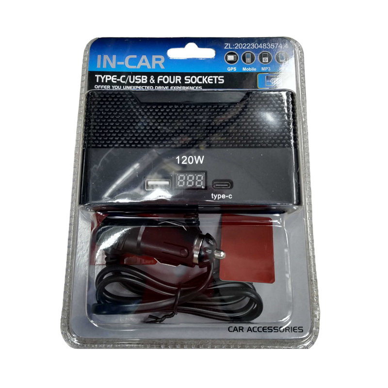 Πολύπριζο φόρτισης αναπτήρα αυτοκινήτου με 4 παροχές αναπτήρα, 1 θύρα USB και 1 θύρα Type-C. Ισχύς: 120W.