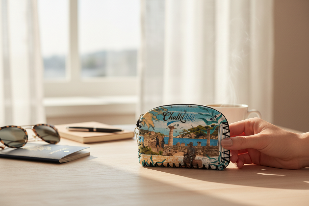 Πορτοφόλι Souvenir μπρελόκ – PVC – Chalkidiki – 14*9cm – 871743 Πορτοφόλι souvenir μπρελόκ από PVC, ιδανικό για την αποθήκευση κερμάτων, κλειδιών και μικροαντικειμένων στην καθημερινότητα. Κατασκευασμένο από ανθεκτικό PVC, προσφέρει προστασία από φθορές και υγρασία, ενώ το πρακτικό και ελαφρύ μέγεθός του το καθιστά εύκολο στη μεταφορά σε τσάντα ή σακίδιο. Το ενσωματωμένο μπρελόκ επιτρέπει την άμεση προσαρμογή σε κλειδιά, εξασφαλίζοντας γρήγορη πρόσβαση και ευκολία χρήσης όπου κι αν βρίσκεστε. Με μοντέρνο souvenir σχεδιασμό, αποτελεί μια πρακτική και λειτουργική επιλογή για καθημερινή χρήση, συνδυάζοντας αντοχή, ευκολία και κομψότητα σε ένα μικρό και χρήσιμο αξεσουάρ.